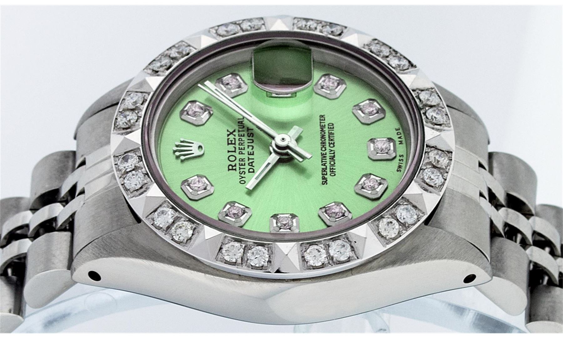 One Ladies Rolex Datejust Polished Bright with Satin Finish, Serviced & Electronically Tested, Stainless Steel Case:26mm, Stainless Steel Crown, Custom Bezel: 18K White Gold Pyramid Diamond Bezel, Diamond Count: 24 Diamonds In Dial. Total Weight .50 Carat, Clarity: SI-VS, Color: G to H. Custom Crystal: Synthetic Sapphire Cyclops Lens. Movement: Automatic Winding Movement Caliber 2030. Custom Dial: Green Diamond Dial. Diamond Count: 10 Diamonds In Dial. Clarity: SI-VS, Color:G to H. Date Window: 3 O'Clock Position Date Display, Model: Datejust. Condition: G-6 Extra Fine The Watch Is In Very Good Condition Free Of All Scratches And Dents. Bracelet:Stainless Steel Jubilee Band With Rolex Crown On Buckle. Bright Polish & Satin Finish. Band Length: 6.0 Inch Length, Adjustable. Standard Clasp, With Rolex Logo.