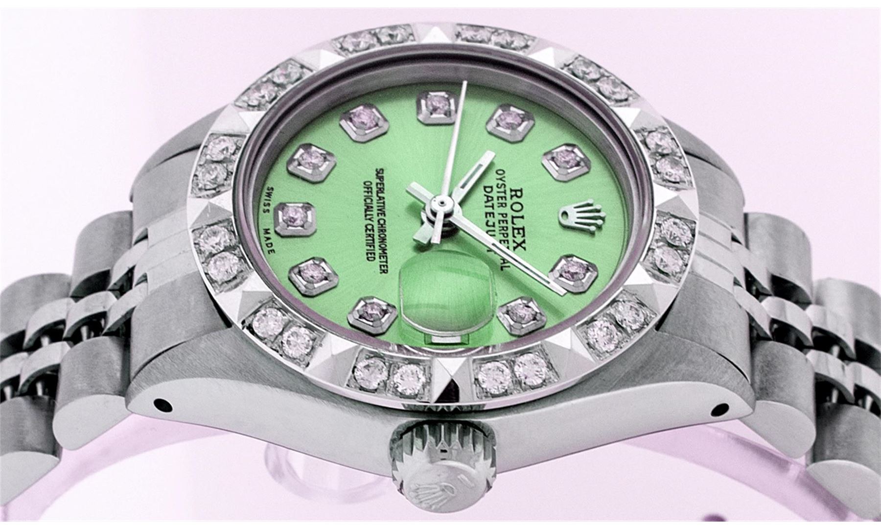 One Ladies Rolex Datejust Polished Bright with Satin Finish, Serviced & Electronically Tested, Stainless Steel Case:26mm, Stainless Steel Crown, Custom Bezel: 18K White Gold Pyramid Diamond Bezel, Diamond Count: 24 Diamonds In Dial. Total Weight .50 Carat, Clarity: SI-VS, Color: G to H. Custom Crystal: Synthetic Sapphire Cyclops Lens. Movement: Automatic Winding Movement Caliber 2030. Custom Dial: Green Diamond Dial. Diamond Count: 10 Diamonds In Dial. Clarity: SI-VS, Color:G to H. Date Window: 3 O'Clock Position Date Display, Model: Datejust. Condition: G-6 Extra Fine The Watch Is In Very Good Condition Free Of All Scratches And Dents. Bracelet:Stainless Steel Jubilee Band With Rolex Crown On Buckle. Bright Polish & Satin Finish. Band Length: 6.0 Inch Length, Adjustable. Standard Clasp, With Rolex Logo.