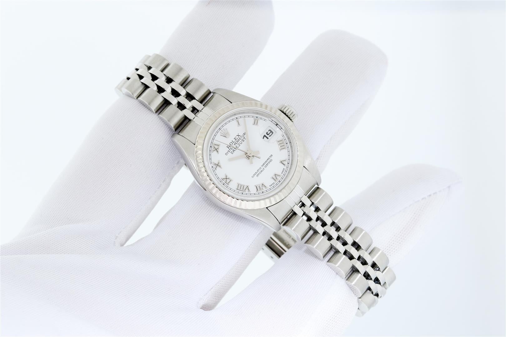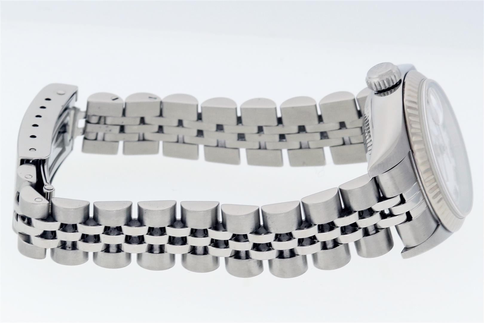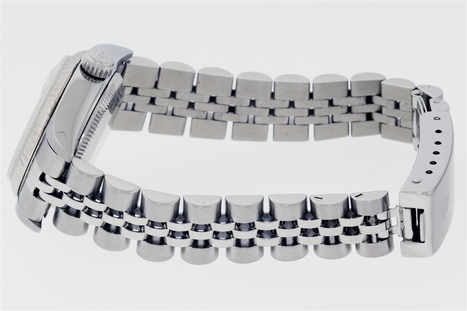 One Quickset Sapphire Pre Owned Ladies Stainless Steel Rolex Datejust Polished Bright with Satin Finish, Serviced & Electronically Tested, Rolex Stainless Steel Case: 26mm, Rolex Stainless Steel Crown, Rolex Bezel: 18K White Gold Fluted Bezel, Crystal: Sa