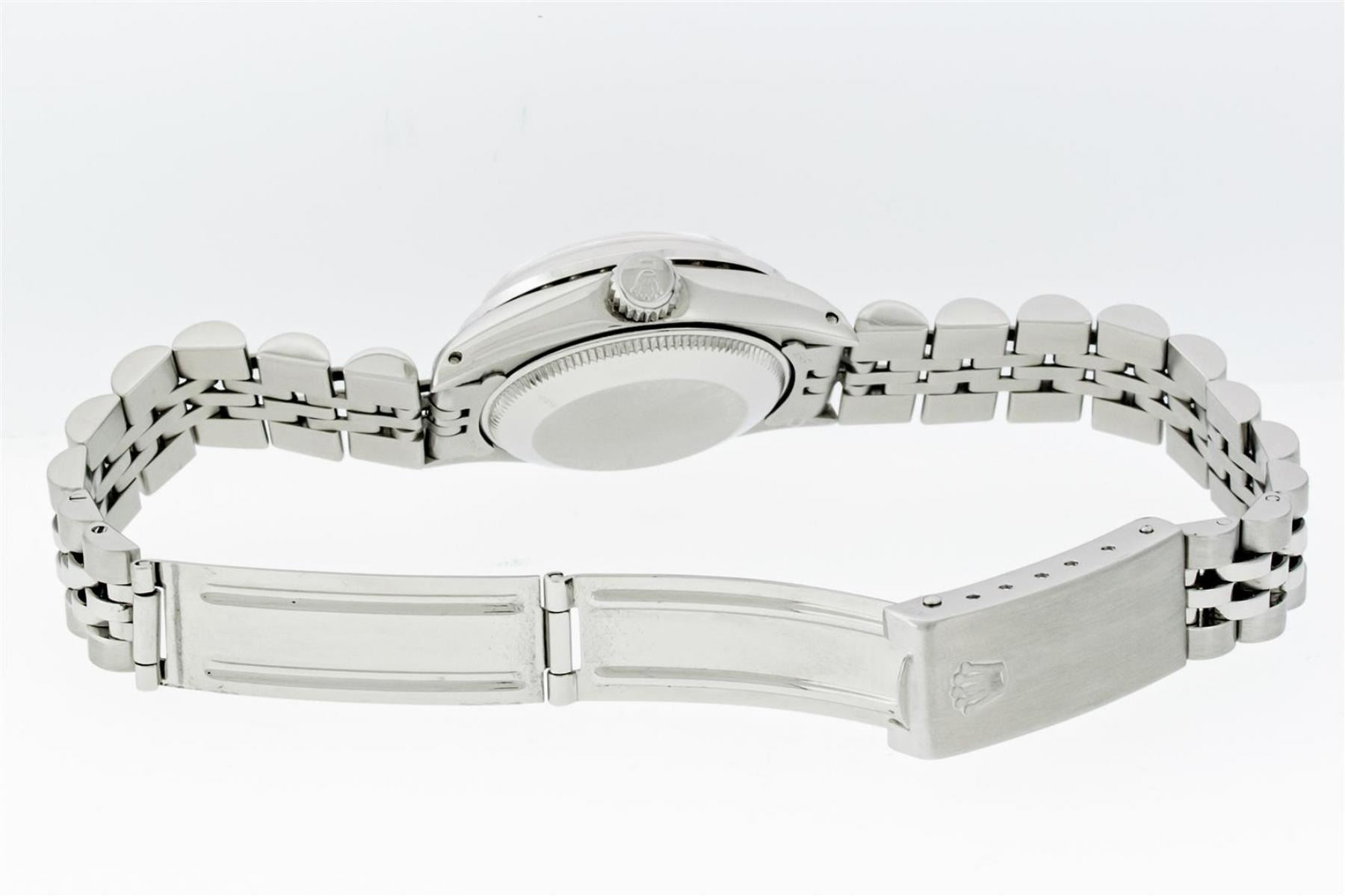 One Ladies Pre Owned Stainless Steel Rolex Datejust Polished Bright with Satin Finish Serviced & Electronically Tested, Rolex Stainless Steel Case: 26mm, Rolex Stainless Steel Crown, Custom Bezel: New 18K White Gold Beadset Diamond Bezel, Diamond Count: 3