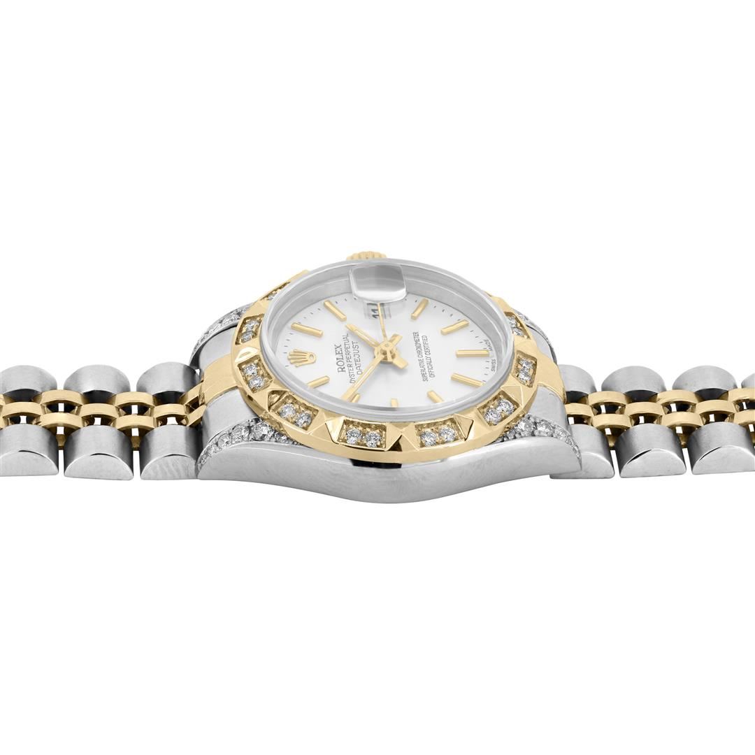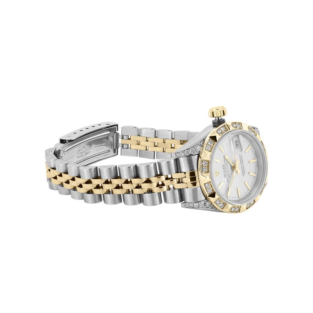 Rolex Ladies Pre Owned Sapphire Quickset 18K Yellow Gold and Stainless Steel Two Tone Datejust Polished Bright with Satin Finish, Serviced & Electronically Tested, Rolex Stainless Steel Case: 26mm, Custom Diamond Lugs: 24 Added Diamonds On Lugs. Rolex 18K Yellow Gold Crown, Custom Bezel: New 18K Yellow Gold Pyramid Diamond Bezel, Diamond Count: 24 Diamonds On Bezel. Custom Crystal: New Sapphire With Magnified Date Window. Custom Hands: New Lumi Hands. Rolex Movement: Automatic Winding Movement 2235. Rolex Dial: Factory Silver Index Dial With Dash Track And Lumi Dots. Date Window: 3 O'Clock Position Date Display, Model: Quickset Datejust, Condition: G-6 Extra Fine. Rolex Bracelet: 18K Yellow Gold & Stainless Steel Jubilee Band. Bright Polish & Satin Finish. 6.0 Inch Length, Adjustable. Fold Clasp, With Rolex Logo. This Watch Has Been Serviced Time Tested And Is In Excellent Condition It Is Free Of All Scratches And Dents. This Watch Comes With A Rolex Box.