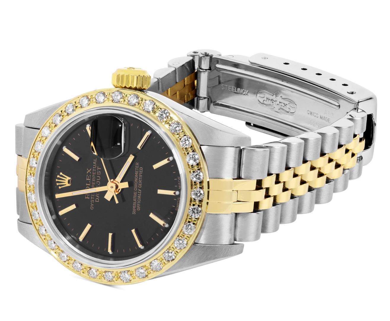 Rolex Ladies Pre Owned Sapphire Quickset 18K Yellow Gold and Stainless Steel Two Tone Datejust Polished Bright with Satin Finish, Serviced And Electronically Tested, Rolex Stainless Steel Case: 26mm, Rolex 18K Yellow Gold Crown, Custom Bezel: New Beadset Diamond Bezel, Diamond Count: 32 Diamonds On Bezel. Custom Crystal: New Sapphire With Magnified Date Window. Custom Hands: New Hands. Rolex Movement: Automatic Winding Movement 2235. Rolex Dial: Factory Black With Index Hour Markers And Dash Track. Date Window: 3 O'Clock Position Date Display, Model: Quickset Datejust, Condition: G-6 Extra Fine. Rolex Bracelet: 18K Yellow Gold And Stainless Steel Jubilee Band. Bright Polish & Satin Finish. 6.0 Inch Length, Adjustable. Standard Clasp, With Rolex Logo. This Watch Has Been Serviced Time Tested And Is In Excellent Condition It Is Free Of All Scratches And Dents. This Watch Comes With A Rolex Box.