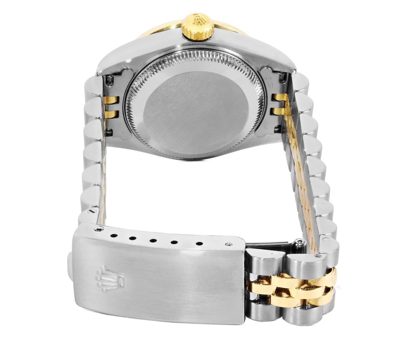 Rolex Ladies Pre Owned Sapphire Quickset 18K Yellow Gold and Stainless Steel Two Tone Datejust Polished Bright with Satin Finish, Serviced And Electronically Tested, Rolex Stainless Steel Case: 26mm, Rolex 18K Yellow Gold Crown, Custom Bezel: New Beadset Diamond Bezel, Diamond Count: 32 Diamonds On Bezel. Custom Crystal: New Sapphire With Magnified Date Window. Custom Hands: New Hands. Rolex Movement: Automatic Winding Movement 2235. Rolex Dial: Factory Black With Index Hour Markers And Dash Track. Date Window: 3 O'Clock Position Date Display, Model: Quickset Datejust, Condition: G-6 Extra Fine. Rolex Bracelet: 18K Yellow Gold And Stainless Steel Jubilee Band. Bright Polish & Satin Finish. 6.0 Inch Length, Adjustable. Standard Clasp, With Rolex Logo. This Watch Has Been Serviced Time Tested And Is In Excellent Condition It Is Free Of All Scratches And Dents. This Watch Comes With A Rolex Box.