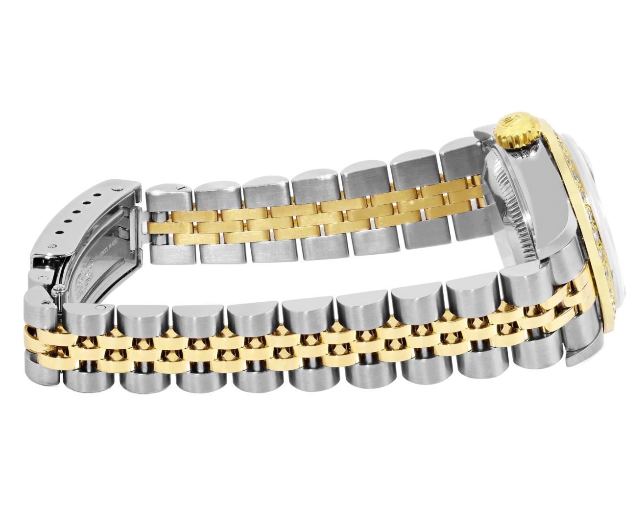Rolex Ladies Pre Owned Sapphire Quickset 18K Yellow Gold and Stainless Steel Two Tone Datejust Polished Bright with Satin Finish, Serviced And Electronically Tested, Rolex Stainless Steel Case: 26mm, Rolex 18K Yellow Gold Crown, Custom Bezel: New Beadset Diamond Bezel, Diamond Count: 32 Diamonds On Bezel. Custom Crystal: New Sapphire With Magnified Date Window. Custom Hands: New Hands. Rolex Movement: Automatic Winding Movement 2235. Rolex Dial: Factory Black With Index Hour Markers And Dash Track. Date Window: 3 O'Clock Position Date Display, Model: Quickset Datejust, Condition: G-6 Extra Fine. Rolex Bracelet: 18K Yellow Gold And Stainless Steel Jubilee Band. Bright Polish & Satin Finish. 6.0 Inch Length, Adjustable. Standard Clasp, With Rolex Logo. This Watch Has Been Serviced Time Tested And Is In Excellent Condition It Is Free Of All Scratches And Dents. This Watch Comes With A Rolex Box.