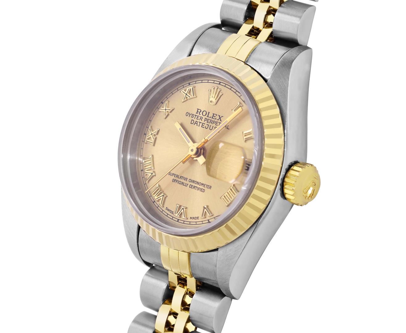 One Ladies Pre Owned Quickset 2T 18K Yellow Gold And Stainless Steel Sapphire Quickset Rolex Datejust Polished Bright with Satin Finish, Serviced And Electronically Tested, Rolex Stainless Steel Case: 26mm, Rolex 18K Yellow Gold Crown, Rolex Bezel: 18K Yellow Gold Fluted Bezel. Crystal: Sapphire With Magnified Date Window. Hands: Luminescent Hands. Rolex Movement: Automatic Winding Movement 2235. Rolex Dial: Champagne Roman With Square Track. Date Window: 3 O'Clock Position Date Display, Model: Sapphire Quickset Datejust. Condition: G-6 Extra Fine. Rolex Bracelet: 18K Yellow Gold & Stainless Steel Jubilee Band. Bright Polish And Satin Finish. 6.0 Inch Length, Adjustable. Standard Clap, With Rolex Logo. This Watch Has Been Serviced Time Tested And Is In Excellent Condition It Is Free Of All Scratches And Dents.