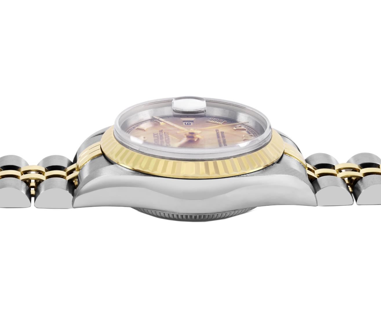 One Ladies Pre Owned Quickset 2T 18K Yellow Gold And Stainless Steel Sapphire Quickset Rolex Datejust Polished Bright with Satin Finish, Serviced And Electronically Tested, Rolex Stainless Steel Case: 26mm, Rolex 18K Yellow Gold Crown, Rolex Bezel: 18K Yellow Gold Fluted Bezel. Crystal: Sapphire With Magnified Date Window. Hands: Luminescent Hands. Rolex Movement: Automatic Winding Movement 2235. Rolex Dial: Champagne Roman With Square Track. Date Window: 3 O'Clock Position Date Display, Model: Sapphire Quickset Datejust. Condition: G-6 Extra Fine. Rolex Bracelet: 18K Yellow Gold & Stainless Steel Jubilee Band. Bright Polish And Satin Finish. 6.0 Inch Length, Adjustable. Standard Clap, With Rolex Logo. This Watch Has Been Serviced Time Tested And Is In Excellent Condition It Is Free Of All Scratches And Dents.