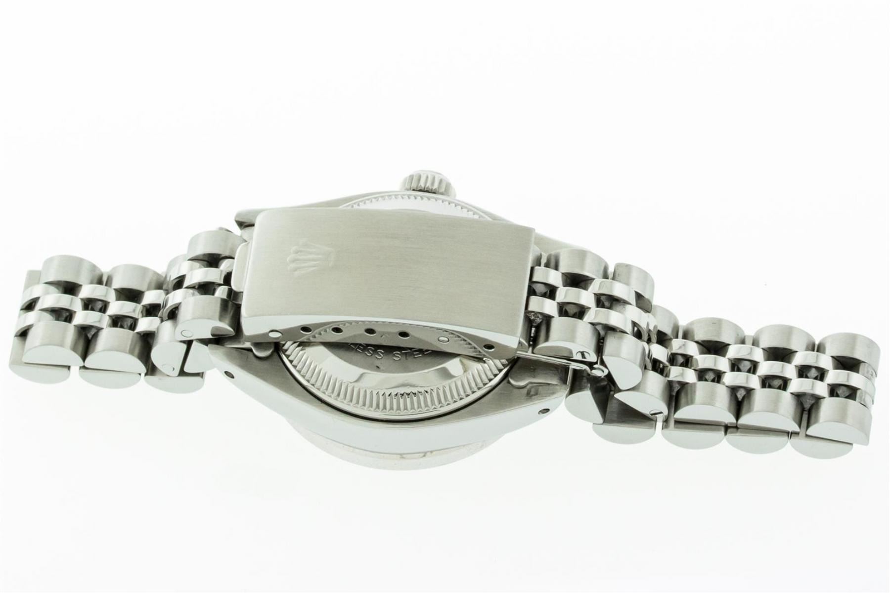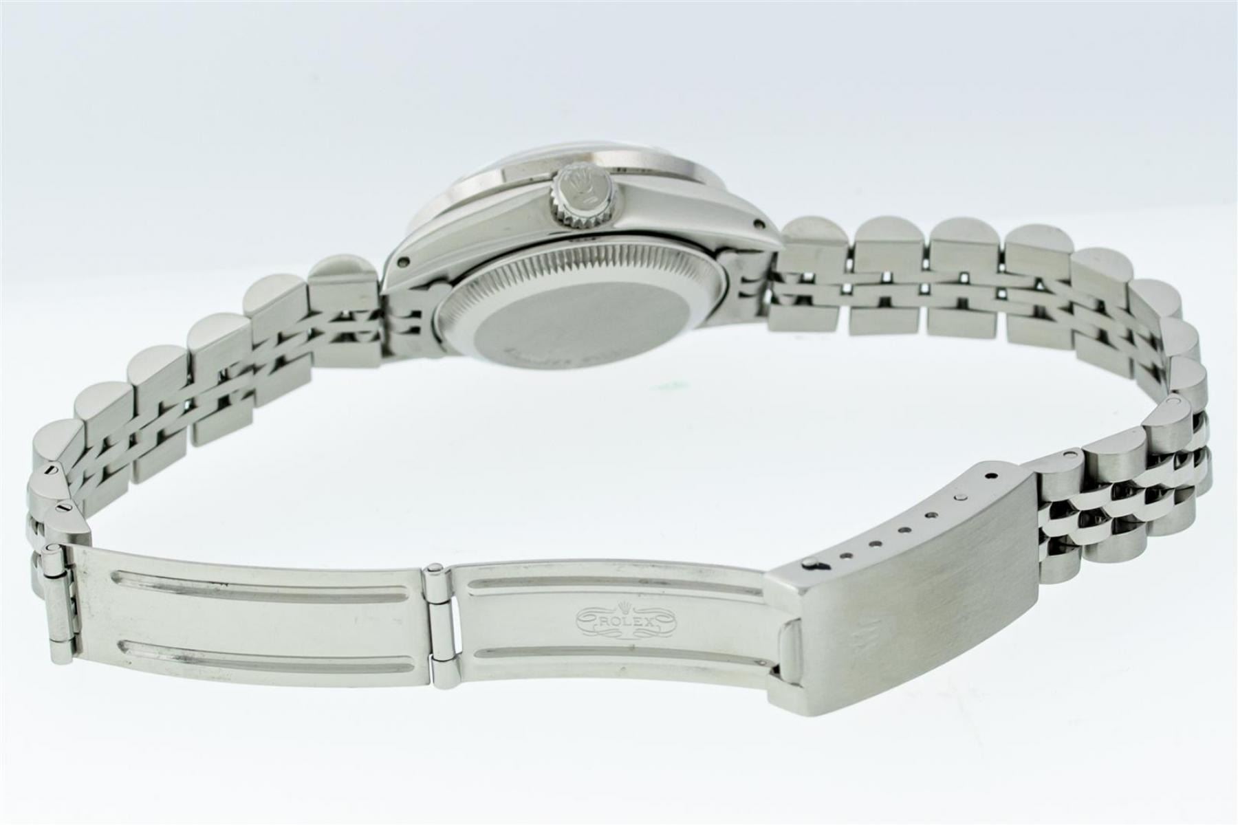 One Ladies Stainless Steel Rolex Datejust Polished Bright with Satin Finish, Serviced & Electronically Tested, Stainless Steel Case: 26mm, Stainless Steel Crown, Custom Bezel: New 18K White Gold Pyramid Diamond Bezel, Diamond Count: 24 Diamonds In Dial. Total Weight .50 Carat, Clarity: SI-VS, Color: G to H. Custom Crystal: New Scratch Resistant Synthetic Sapphire Cyclops Lens. Custom Hands: New Luminescent Hands. Movement: Automatic Winding Movement. Custom Dial: Blue Diamond Dial. Diamond Count: 10 Diamonds In Dial. Clarity: SI-VS, Color: G to H. Date Window: 3 O'Clock Position Date Display, Model: Datejust. Condition: G-6 Extra Fine. Bracelet: Stainless Steel Jubilee Band With Rolex Crown On Buckle. Bright Polish & Satin Finish. Band Length: 6.0 Inch Length, Adjustable. Standard Clasp, With Rolex Logo. This Watch Has Been Serviced Time Tested And Is In Excellent Condition It Is Free Of All Scratches And Dents. This Watch Comes With A Rolex Box.