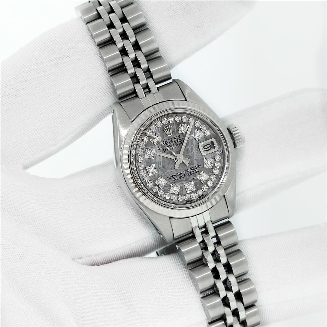One Ladies Stainless Steel Rolex Datejust Polished Bright with Satin Finish, Serviced & Electronically Tested, Rolex Stainless Steel Case: 26mm, Rolex Stainless Steel Crown, Rolex Bezel: White Gold Fluted Bezel. Custom Crystal: New With Magnifying Date Window. Custom Hands: New Luminescent Hands. Rolex Movement: Automatic Winding Movement. Custom Dial: Meteorite String Diamond Dial, Stone Count: 43 Diamonds On Dial, G To H In Color, Clarity: SI-VS. Date Window: 3 O'clock Position Date Display, Model: Datejust. Condition: G-6 Extra Fine. Rolex Bracelet: Stainless Steel Jubilee Band. Bright Polish & Satin Finish. 6.0 Inch Length, Adjustable. Standard Clasp, With Rolex Logo. This Pre Owned Watch Has Been Serviced Time Tested And Is In Excellent Condition It Is Free Of All Scratches And Dents.