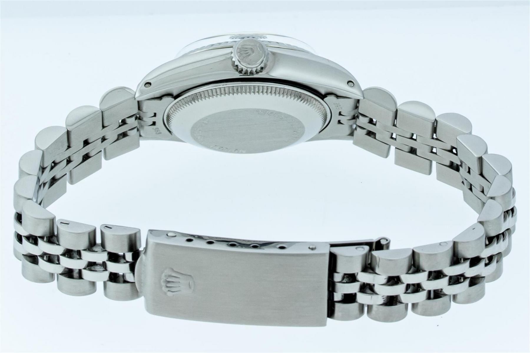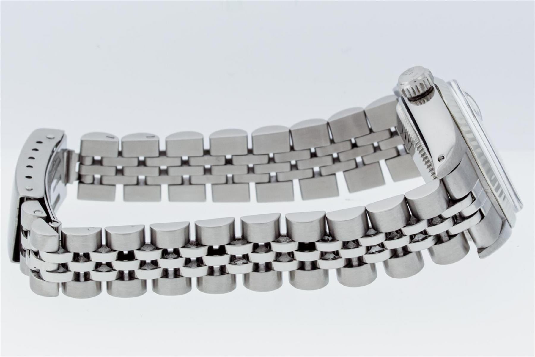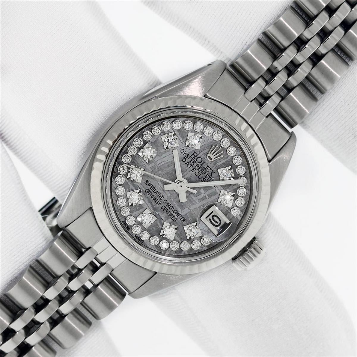 One Ladies Stainless Steel Rolex Datejust Polished Bright with Satin Finish, Serviced & Electronically Tested, Stainless Steel Case: 26mm, Stainless Steel Crown, Bezel: White Gold Fluted Bezel. Custom Crystal: Acrylic Cyclops Crystal With Magnifying Date Window. Custom Hands: New Luminescent Hands. Movement: Automatic Winding Movement. Custom Dial: Meteorite String Diamond Dial, Stone Count: 43 Diamonds On Dial, G To H In Color, Clarity: SI-VS. Date Window: 3 O'Clock Position Date Display, Model: Datejust. Condition: G-6 Extra Fine. Bracelet: Stainless Steel Jubilee Band. Bright Polish & Satin Finish. 6.0 Inch Length, Adjustable. Standard Clasp, With Rolex Logo. This Watch Has Been Serviced Time Tested And Is In Excellent Condition It Is Free Of All Scratches And Dents. This Watch Comes With A Rolex Box.