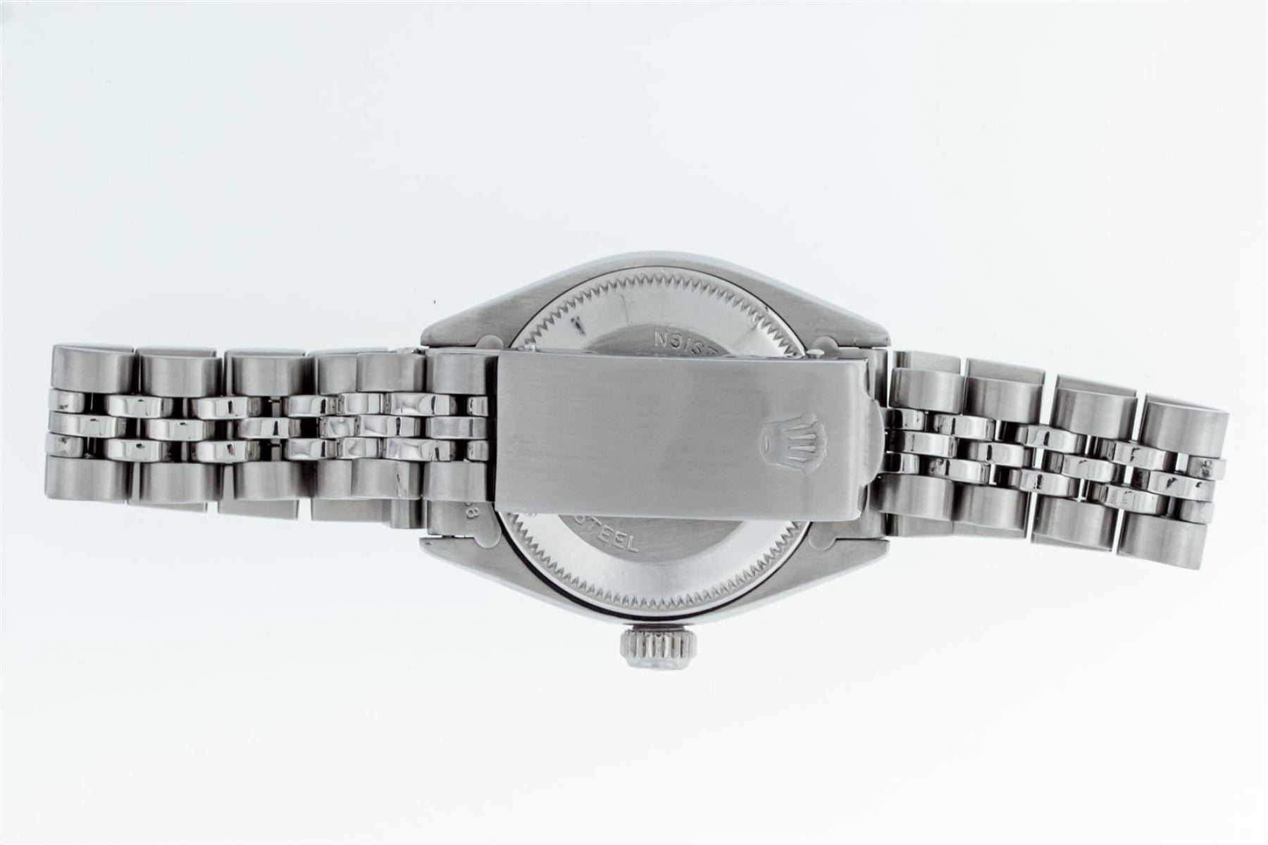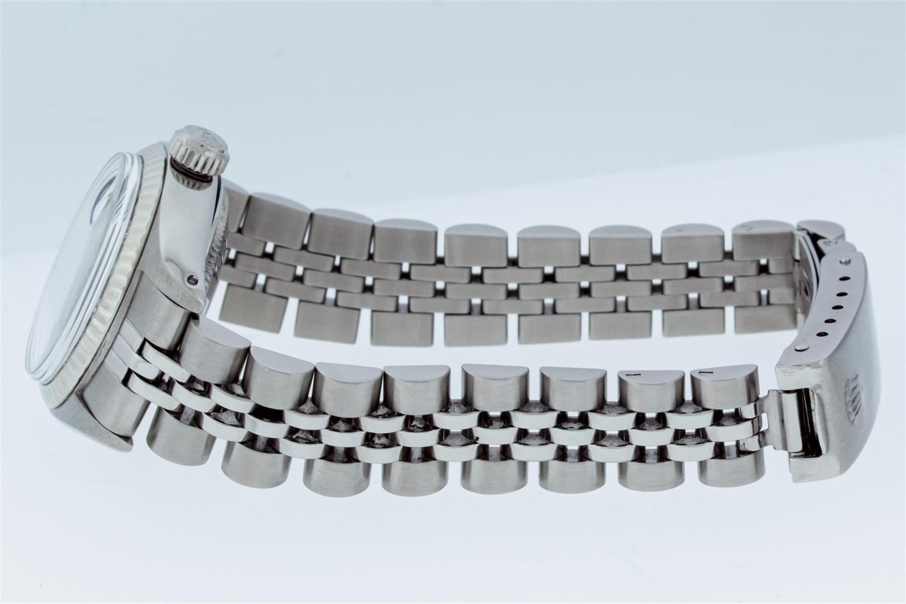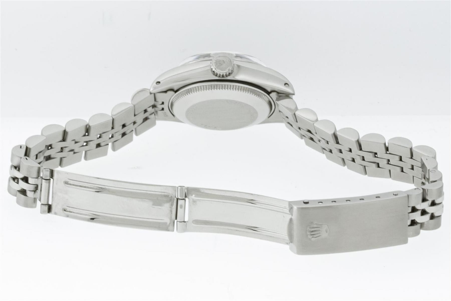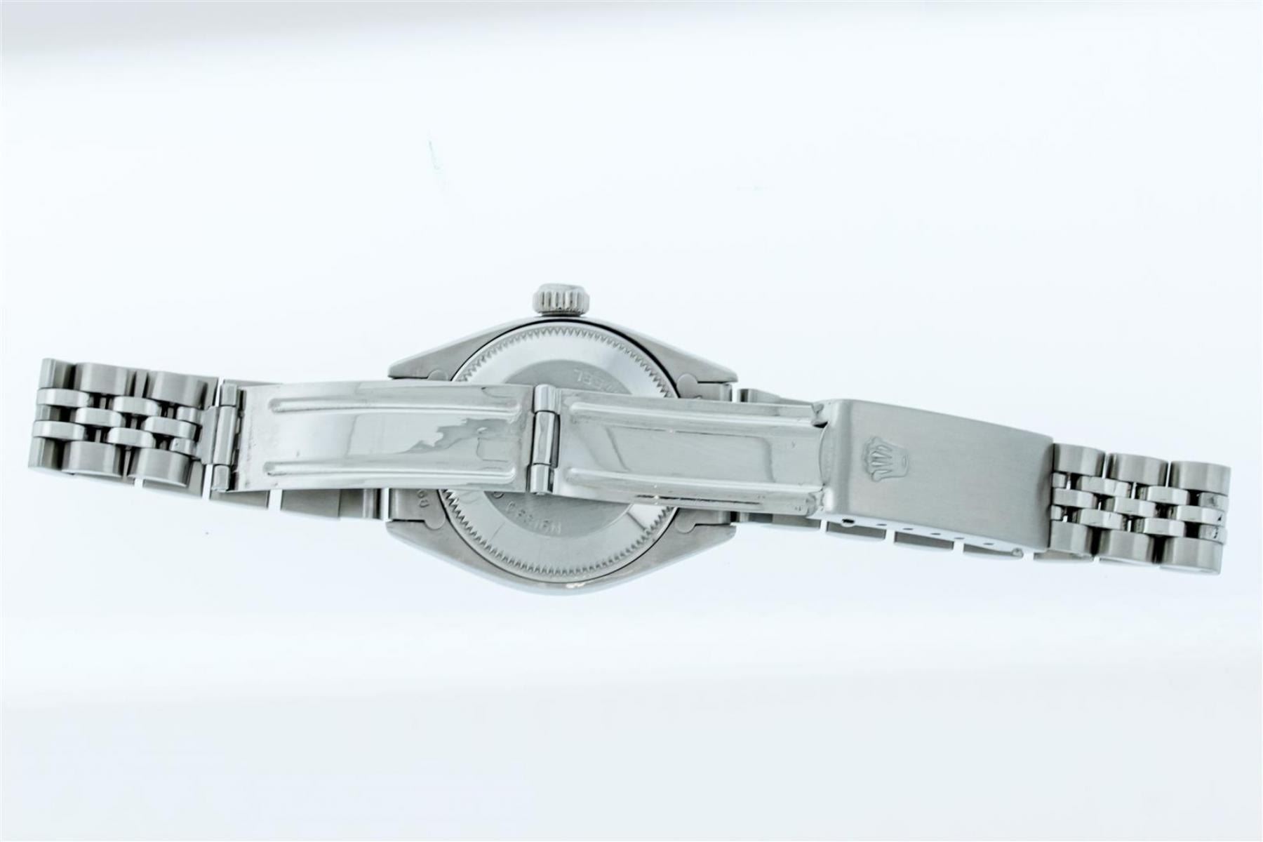One Ladies Stainless Steel Rolex Datejust Polished Bright with Satin Finish, Serviced & Electronically Tested, Stainless Steel Case: 26mm, Stainless Steel Crown, Bezel: White Gold Fluted Bezel. Custom Crystal: Acrylic Cyclops Crystal With Magnifying Date Window. Custom Hands: New Luminescent Hands. Movement: Automatic Winding Movement. Custom Dial: Meteorite String Diamond Dial, Stone Count: 43 Diamonds On Dial, G To H In Color, Clarity: SI-VS. Date Window: 3 O'Clock Position Date Display, Model: Datejust. Condition: G-6 Extra Fine. Bracelet: Stainless Steel Jubilee Band. Bright Polish & Satin Finish. 6.0 Inch Length, Adjustable. Standard Clasp, With Rolex Logo. This Watch Has Been Serviced Time Tested And Is In Excellent Condition It Is Free Of All Scratches And Dents. This Watch Comes With A Rolex Box.