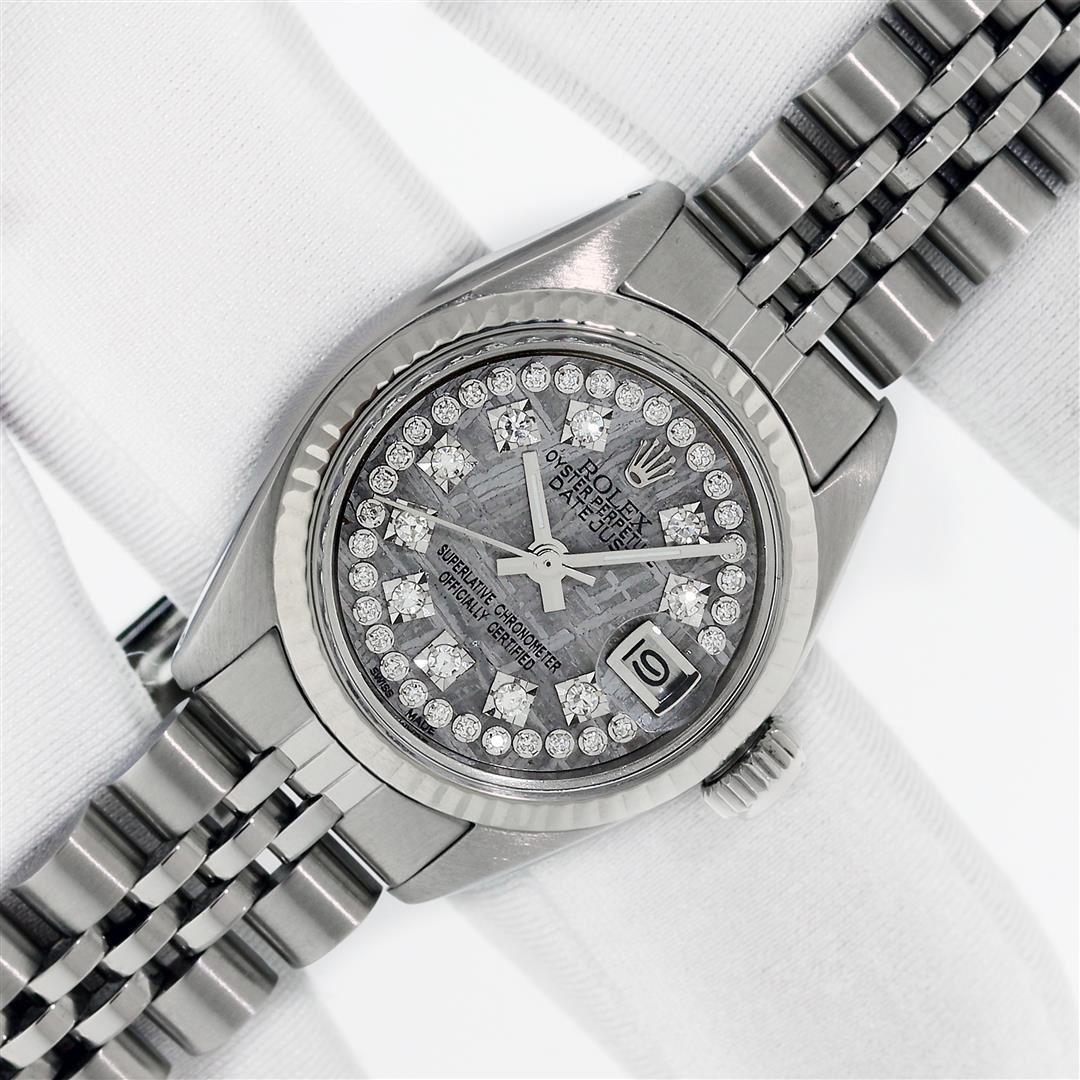 One Ladies Stainless Steel Rolex Datejust Polished Bright with Satin Finish, Serviced & Electronically Tested, Stainless Steel Case: 26mm, Stainless Steel Crown, Bezel: White Gold Fluted Bezel. Custom Crystal: Acrylic Cyclops Crystal With Magnifying Date Window. Custom Hands: New Luminescent Hands. Movement: Automatic Winding Movement. Custom Dial: Meteorite String Diamond Dial, Stone Count: 43 Diamonds On Dial, G To H In Color, Clarity: SI-VS. Date Window: 3 O'Clock Position Date Display, Model: Datejust. Condition: G-6 Extra Fine. Bracelet: Stainless Steel Jubilee Band. Bright Polish & Satin Finish. 6.0 Inch Length, Adjustable. Standard Clasp, With Rolex Logo. This Watch Has Been Serviced Time Tested And Is In Excellent Condition It Is Free Of All Scratches And Dents. This Watch Comes With A Rolex Box.
