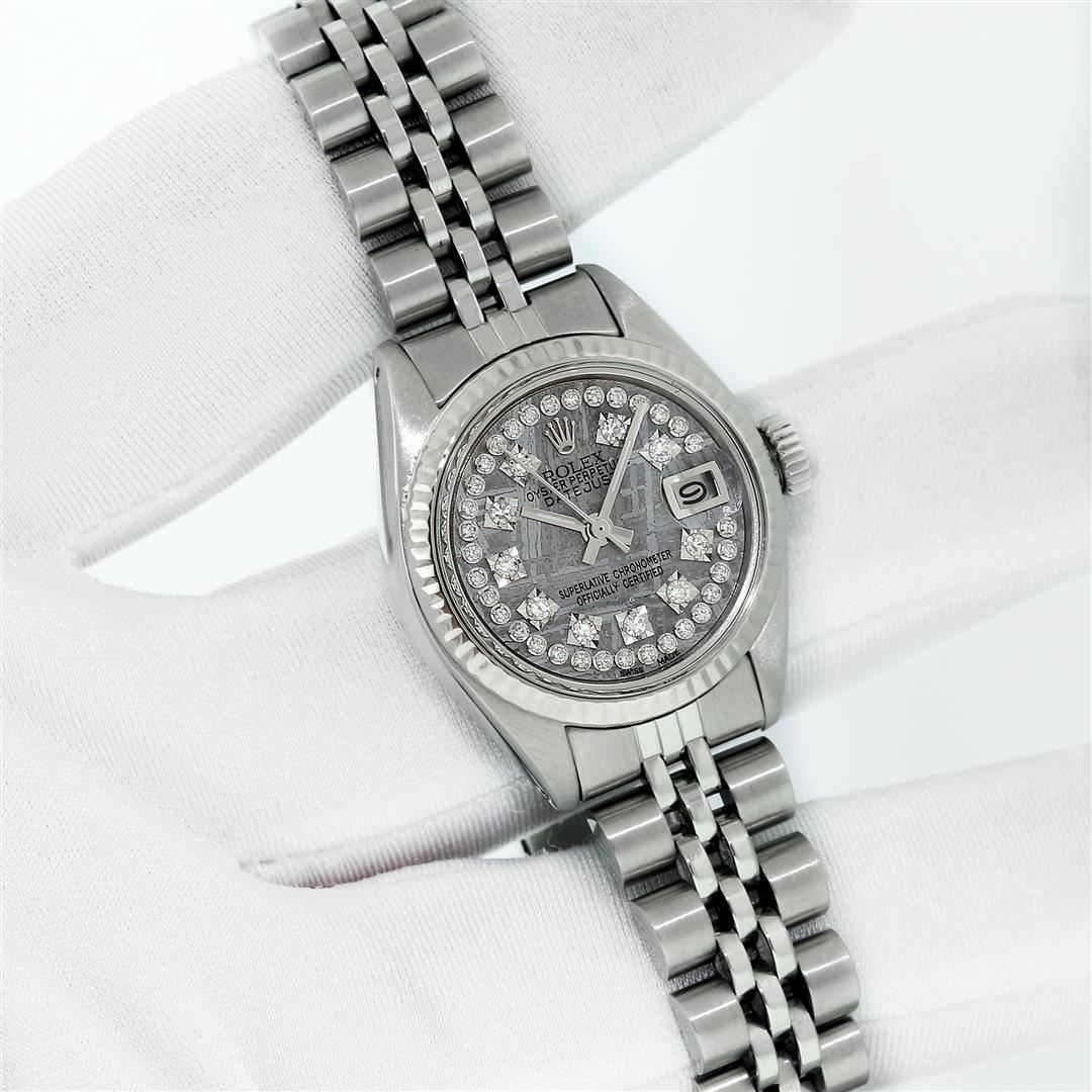 One Ladies Stainless Steel Rolex Datejust Polished Bright with Satin Finish, Serviced & Electronically Tested, Stainless Steel Case: 26mm, Stainless Steel Crown, Bezel: White Gold Fluted Bezel. Custom Crystal: Acrylic Cyclops Crystal With Magnifying Date Window. Custom Hands: New Luminescent Hands. Movement: Automatic Winding Movement. Custom Dial: Meteorite String Diamond Dial, Stone Count: 43 Diamonds On Dial, G To H In Color, Clarity: SI-VS. Date Window: 3 O'Clock Position Date Display, Model: Datejust. Condition: G-6 Extra Fine. Bracelet: Stainless Steel Jubilee Band. Bright Polish & Satin Finish. 6.0 Inch Length, Adjustable. Standard Clasp, With Rolex Logo. This Watch Has Been Serviced Time Tested And Is In Excellent Condition It Is Free Of All Scratches And Dents. This Watch Comes With A Rolex Box.