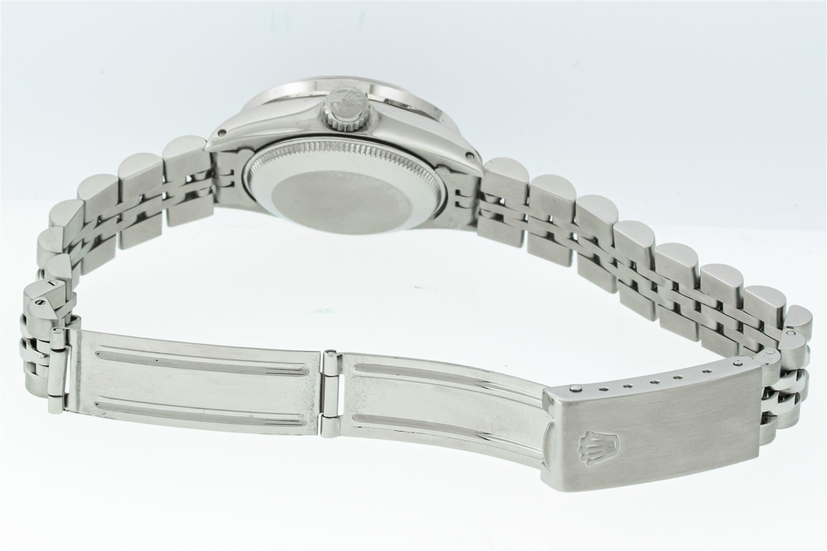 One Ladies Stainless Steel Rolex Datejust Polished Bright with Satin Finish, Serviced & Electronically Tested, Stainless Steel Case: 26mm, Stainless Steel Crown, Custom Bezel: New 18K White Gold Pyramid Diamond Bezel, Diamond Count: 24 Diamonds In Dial. Total Weight .50 Carat, Clarity: SI-VS, Color: G to H. Custom Crystal: New Scratch Resistant Synthetic Sapphire Cyclops Lens. Custom Hands: New Luminescent Hands. Movement: Automatic Winding Movement. Dial: Salmon Roman Dial. Date Window: 3 O'Clock Position Date Display, Model: Datejust. Condition: G-6 Extra Fine. Bracelet: Stainless Steel Jubilee Band With Rolex Crown On Buckle. Bright Polish & Satin Finish. Band Length: 6.0 Inch Length, Adjustable. Standard Clasp, With Rolex Logo. This Watch Has Been Serviced Time Tested And Is In Excellent Condition It Is Free Of All Scratches And Dents.