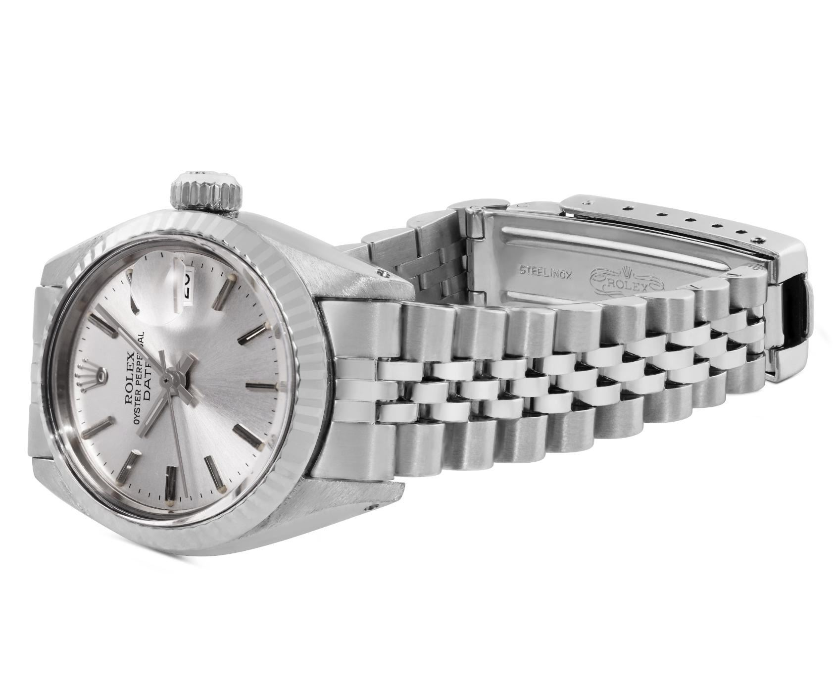 This Lady Rolex Date watch features a silver dial with index hour markers and a custom plastic crystal, with a magnified date window. The timepiece has Rolex 14K white gold fluted bezel. The Rolex 26mm case is crafted from stainless steel and includes a Rolex screw-down crown. The bracelet is a Rolex stainless steel Jubilee band, designed to fit wrists up to 6 inches in circumference. The Watch Is Powered by the Rolex automatic self-winding Caliber 2035 movement. This watch has been polished and serviced and is in excellent condition. It will also be time tested before shipment.