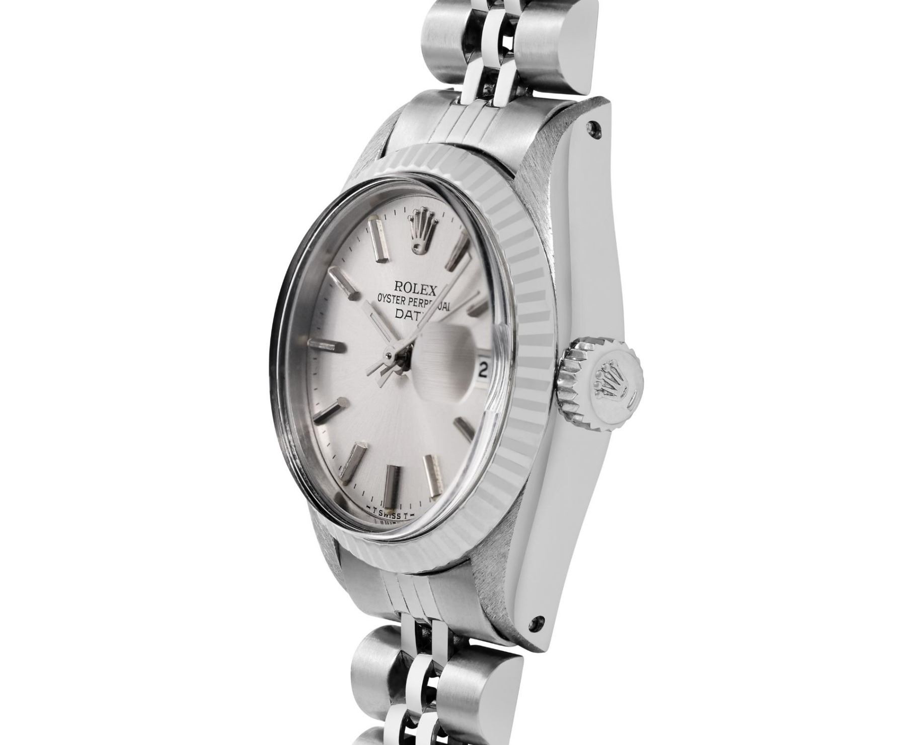 This Lady Rolex Date watch features a silver dial with index hour markers and a custom plastic crystal, with a magnified date window. The timepiece has Rolex 14K white gold fluted bezel. The Rolex 26mm case is crafted from stainless steel and includes a Rolex screw-down crown. The bracelet is a Rolex stainless steel Jubilee band, designed to fit wrists up to 6 inches in circumference. The Watch Is Powered by the Rolex automatic self-winding Caliber 2035 movement. This watch has been polished and serviced and is in excellent condition. It will also be time tested before shipment.