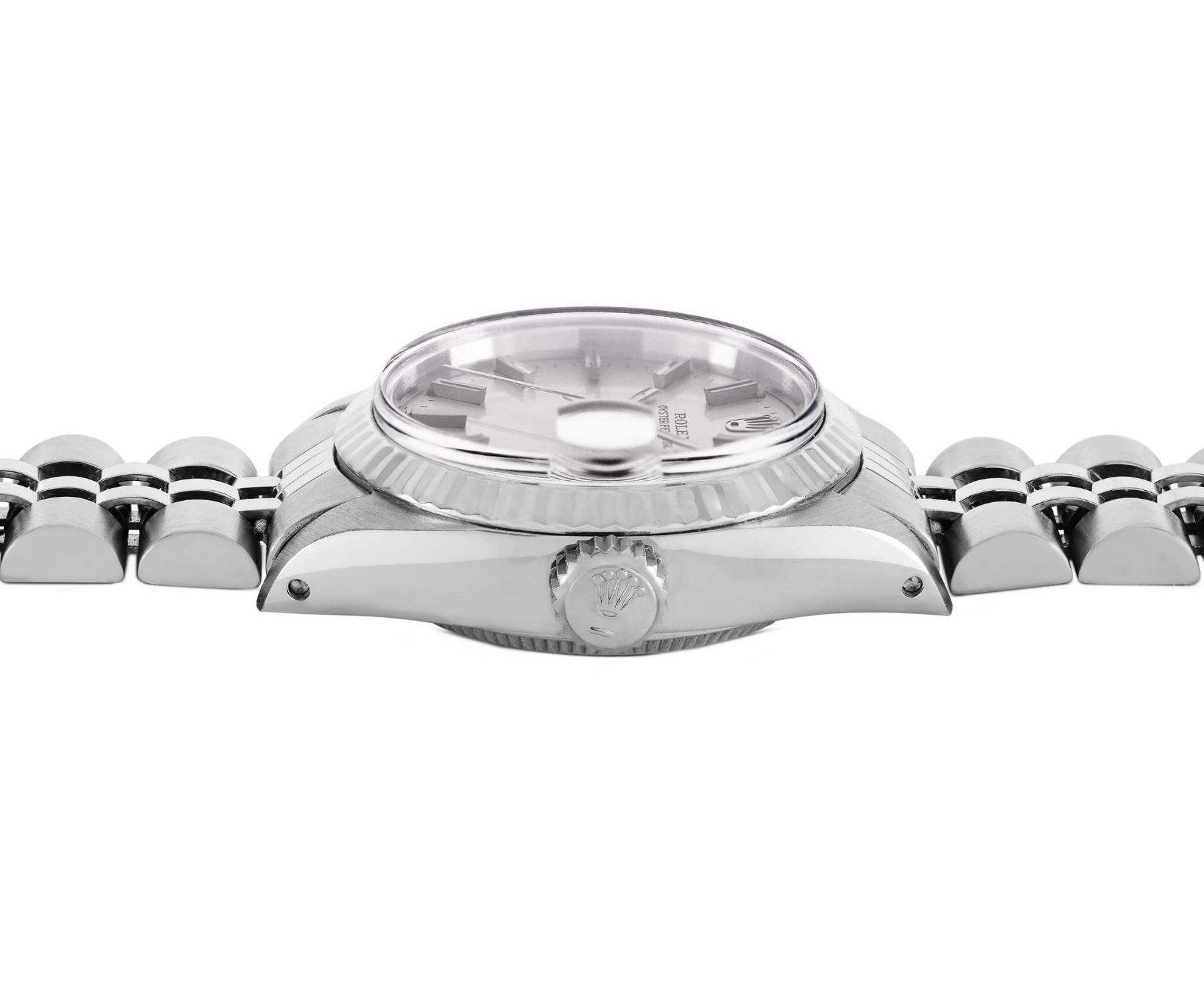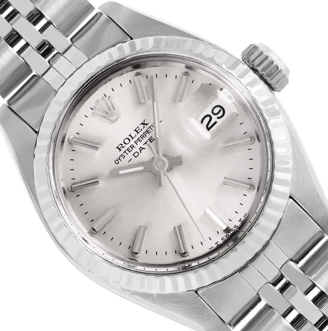 This Lady Rolex Date watch features a silver dial with index hour markers and a custom plastic crystal, with a magnified date window. The timepiece has Rolex 14K white gold fluted bezel. The Rolex 26mm case is crafted from stainless steel and includes a Rolex screw-down crown. The bracelet is a Rolex stainless steel Jubilee band, designed to fit wrists up to 6 inches in circumference. The Watch Is Powered by the Rolex automatic self-winding Caliber 2035 movement. This watch has been polished and serviced and is in excellent condition. It will also be time tested before shipment.