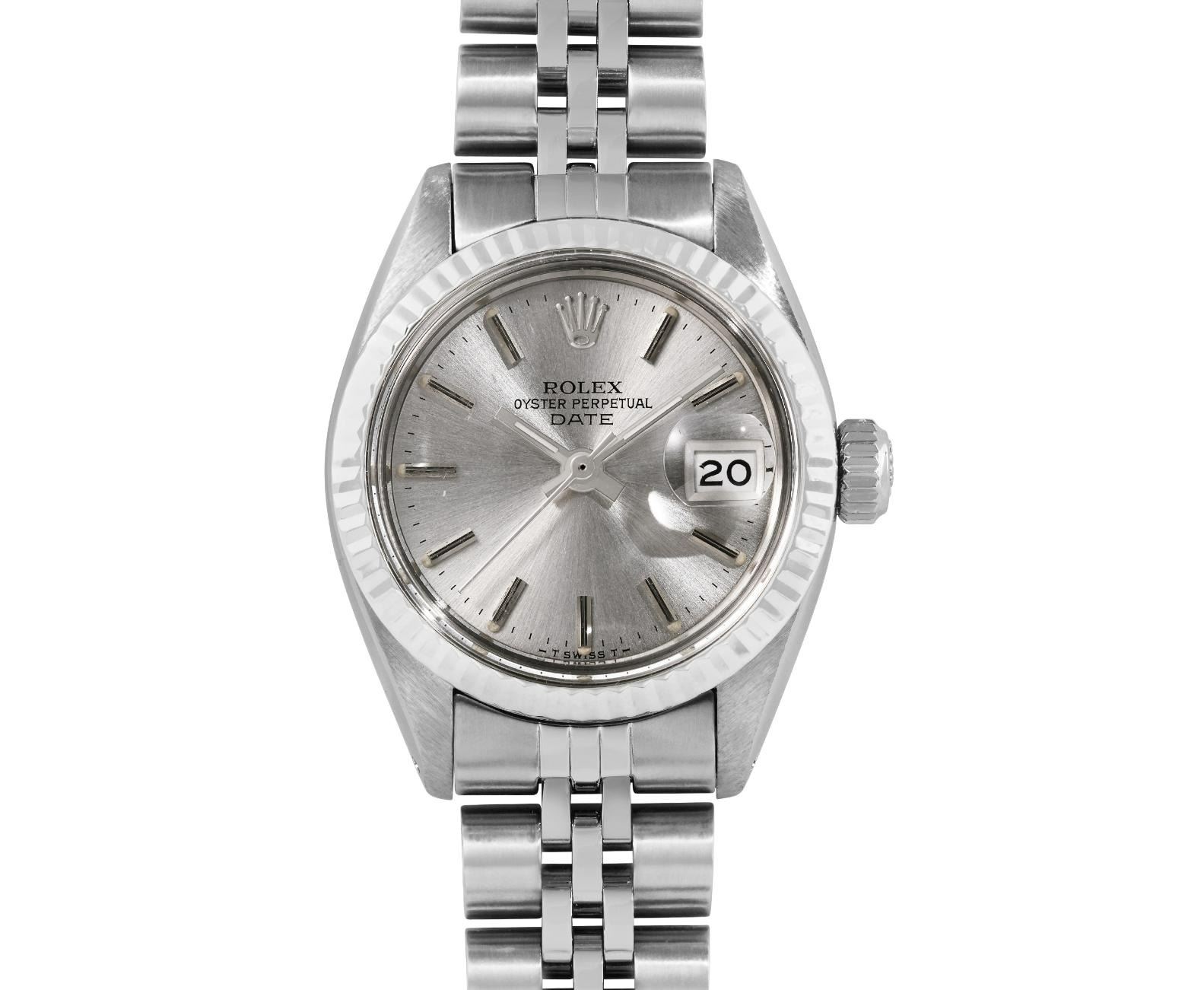 This Lady Rolex Date watch features a silver dial with index hour markers and a custom plastic crystal, with a magnified date window. The timepiece has Rolex 14K white gold fluted bezel. The Rolex 26mm case is crafted from stainless steel and includes a Rolex screw-down crown. The bracelet is a Rolex stainless steel Jubilee band, designed to fit wrists up to 6 inches in circumference. The Watch Is Powered by the Rolex automatic self-winding Caliber 2035 movement. This watch has been polished and serviced and is in excellent condition. It will also be time tested before shipment.