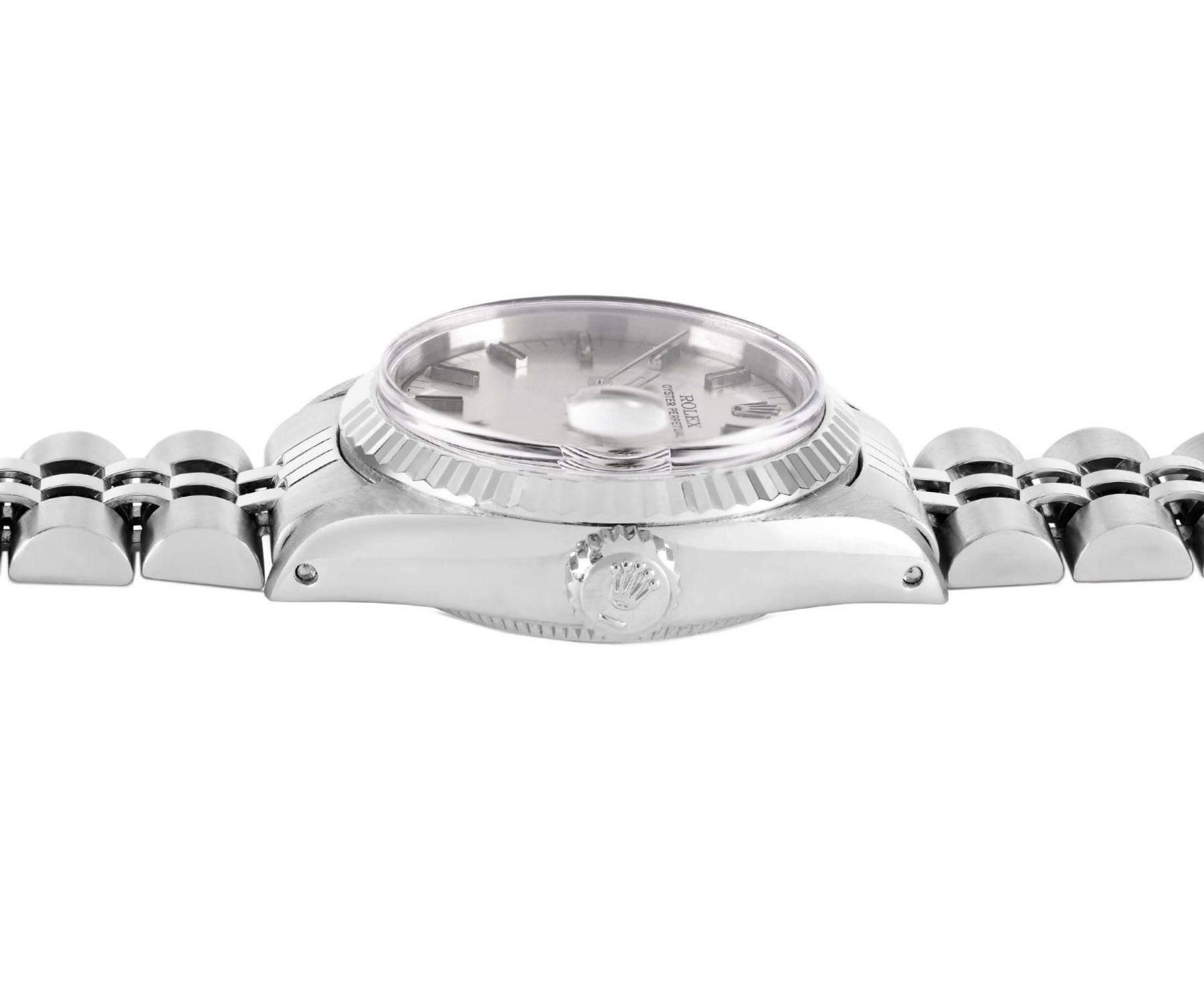This Lady Rolex Date watch features a silver dial with index hour markers and a custom plastic crystal, with a magnified date window. The timepiece has Rolex 14K white gold fluted bezel. The Rolex 26mm case is crafted from stainless steel and includes a Rolex screw-down crown. The bracelet is a Rolex stainless steel Jubilee band, designed to fit wrists up to 6 inches in circumference. The Watch Is Powered by the Rolex automatic self-winding Caliber 2035 movement. This watch has been polished and serviced and is in excellent condition. It will also be time tested before shipment.