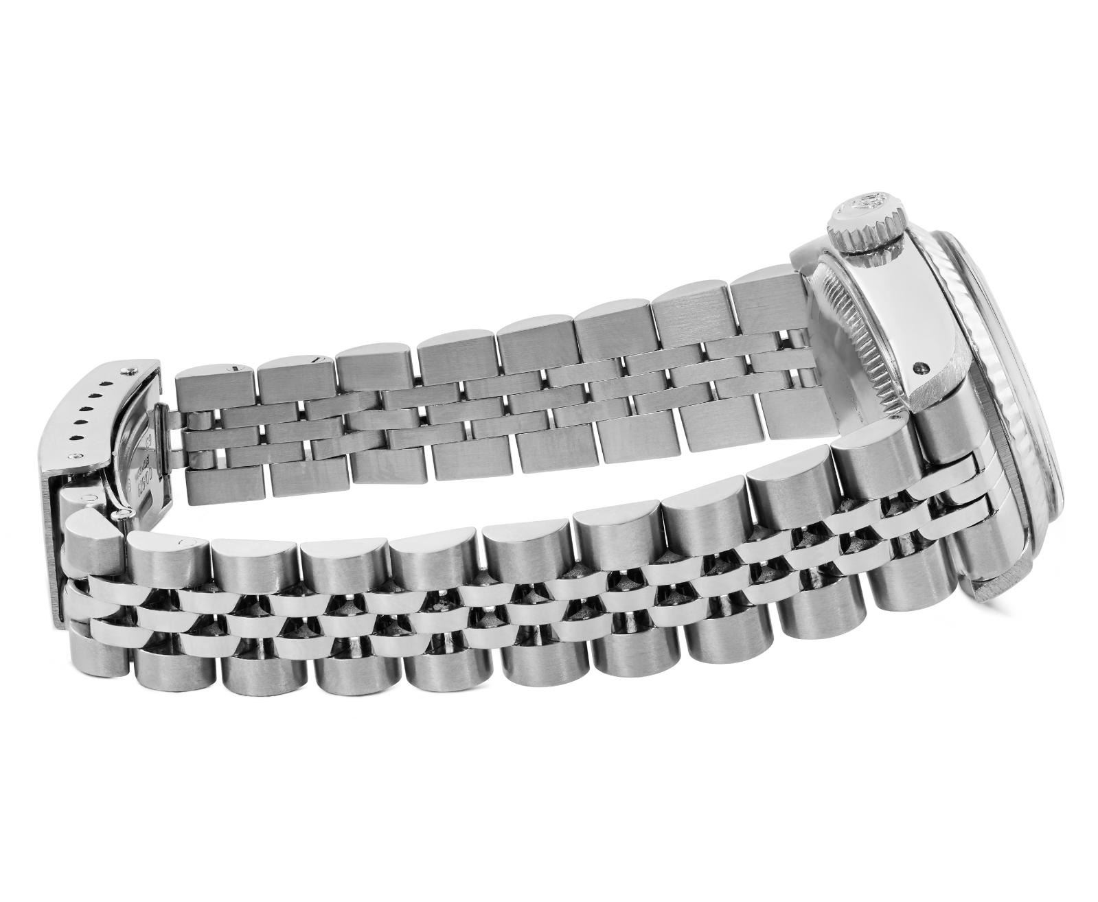 This Lady Rolex Date watch features a silver dial with index hour markers and a custom plastic crystal, with a magnified date window. The timepiece has Rolex 14K white gold fluted bezel. The Rolex 26mm case is crafted from stainless steel and includes a Rolex screw-down crown. The bracelet is a Rolex stainless steel Jubilee band, designed to fit wrists up to 6 inches in circumference. The Watch Is Powered by the Rolex automatic self-winding Caliber 2035 movement. This watch has been polished and serviced and is in excellent condition. It will also be time tested before shipment.