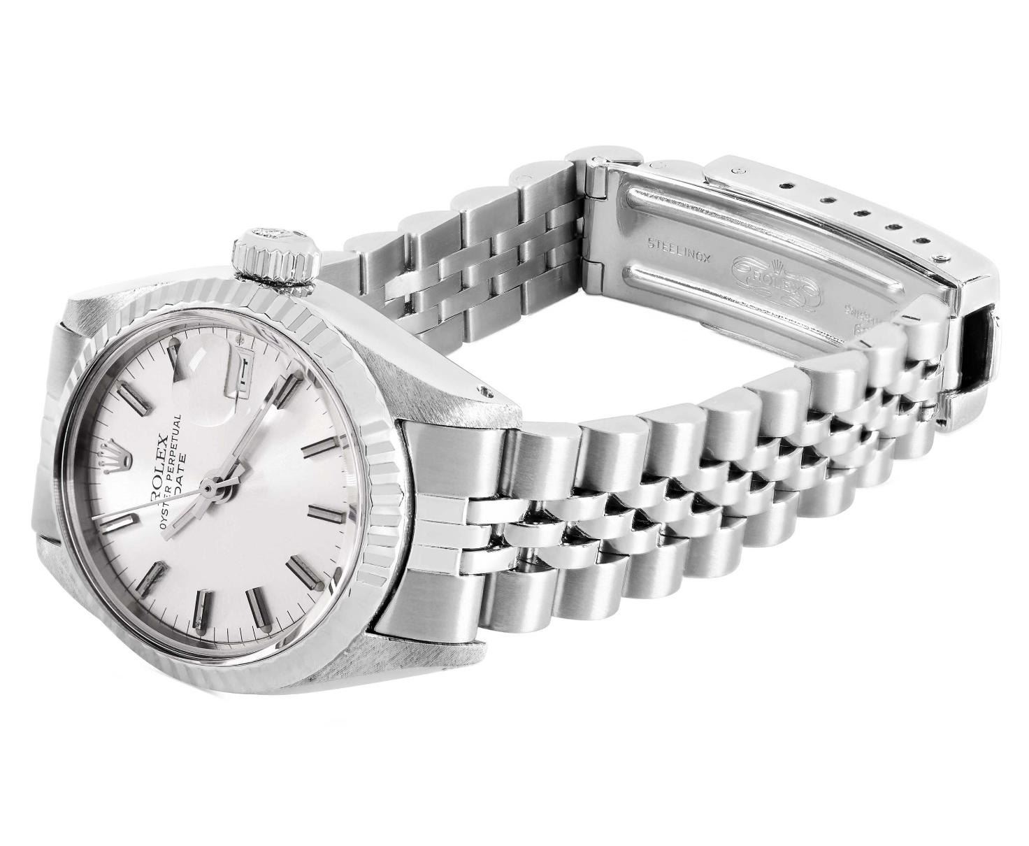 This Lady Rolex Date watch features a silver dial with index hour markers and a custom plastic crystal, with a magnified date window. The timepiece has Rolex 14K white gold fluted bezel. The Rolex 26mm case is crafted from stainless steel and includes a Rolex screw-down crown. The bracelet is a Rolex stainless steel Jubilee band, designed to fit wrists up to 6 inches in circumference. The Watch Is Powered by the Rolex automatic self-winding Caliber 2035 movement. This watch has been polished and serviced and is in excellent condition. It will also be time tested before shipment.