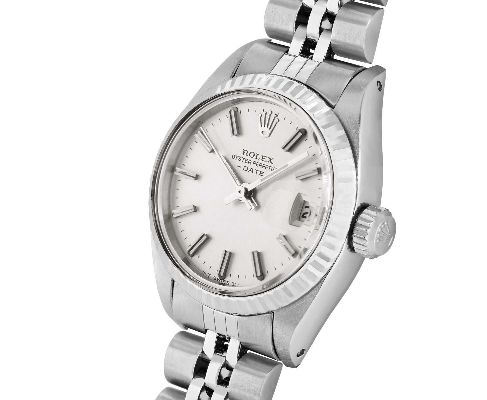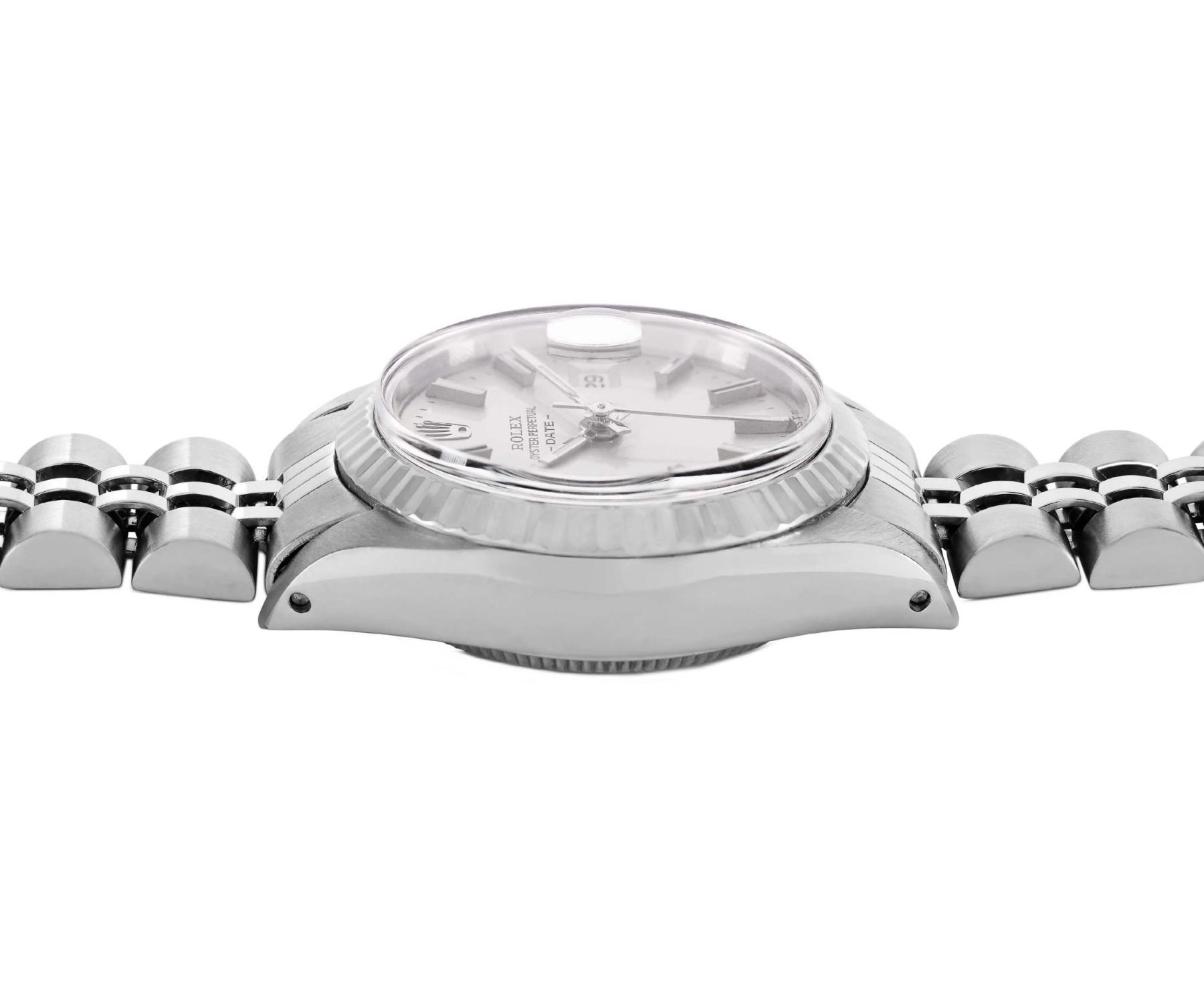 This Lady Rolex Date watch features a silver dial with index hour markers and a custom plastic crystal, with a magnified date window. The timepiece has Rolex 14K white gold fluted bezel. The Rolex 26mm case is crafted from stainless steel and includes a Rolex screw-down crown. The bracelet is a Rolex stainless steel Jubilee band, designed to fit wrists up to 6 inches in circumference. The Watch Is Powered by the Rolex automatic self-winding Caliber 2035 movement. This watch has been polished and serviced and is in excellent condition. It will also be time tested before shipment.