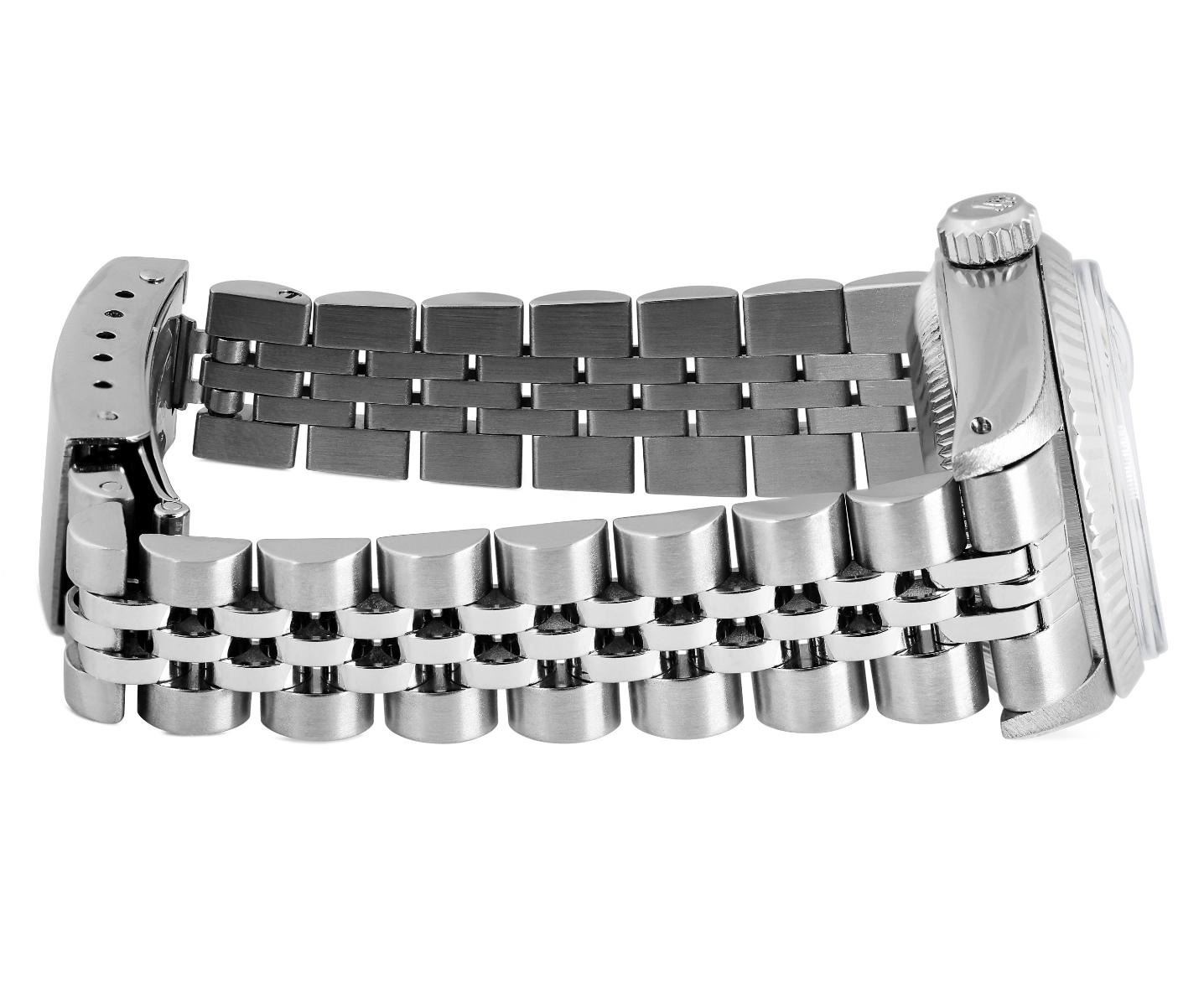 This Lady Rolex Date watch features a silver dial with index hour markers and a custom plastic crystal, with a magnified date window. The timepiece has Rolex 14K white gold fluted bezel. The Rolex 26mm case is crafted from stainless steel and includes a Rolex screw-down crown. The bracelet is a Rolex stainless steel Jubilee band, designed to fit wrists up to 6 inches in circumference. The Watch Is Powered by the Rolex automatic self-winding Caliber 2035 movement. This watch has been polished and serviced and is in excellent condition. It will also be time tested before shipment.