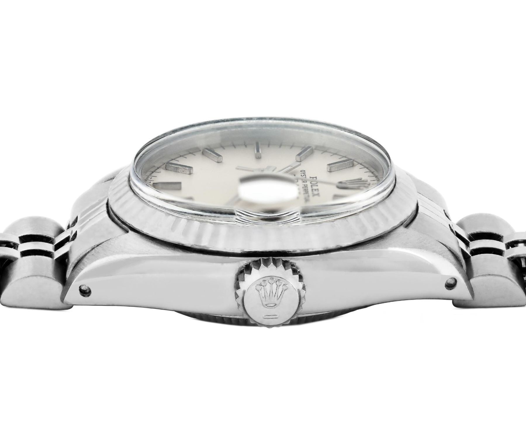This Lady Rolex Date watch features a silver dial with index hour markers and a custom plastic crystal, with a magnified date window. The timepiece has Rolex 14K white gold fluted bezel. The Rolex 26mm case is crafted from stainless steel and includes a Rolex screw-down crown. The bracelet is a Rolex stainless steel Jubilee band, designed to fit wrists up to 6 inches in circumference. The Watch Is Powered by the Rolex automatic self-winding Caliber 2035 movement. This watch has been polished and serviced and is in excellent condition. It will also be time tested before shipment.