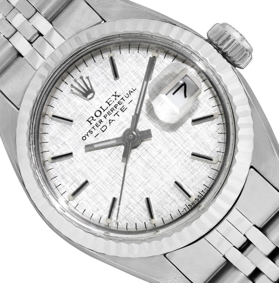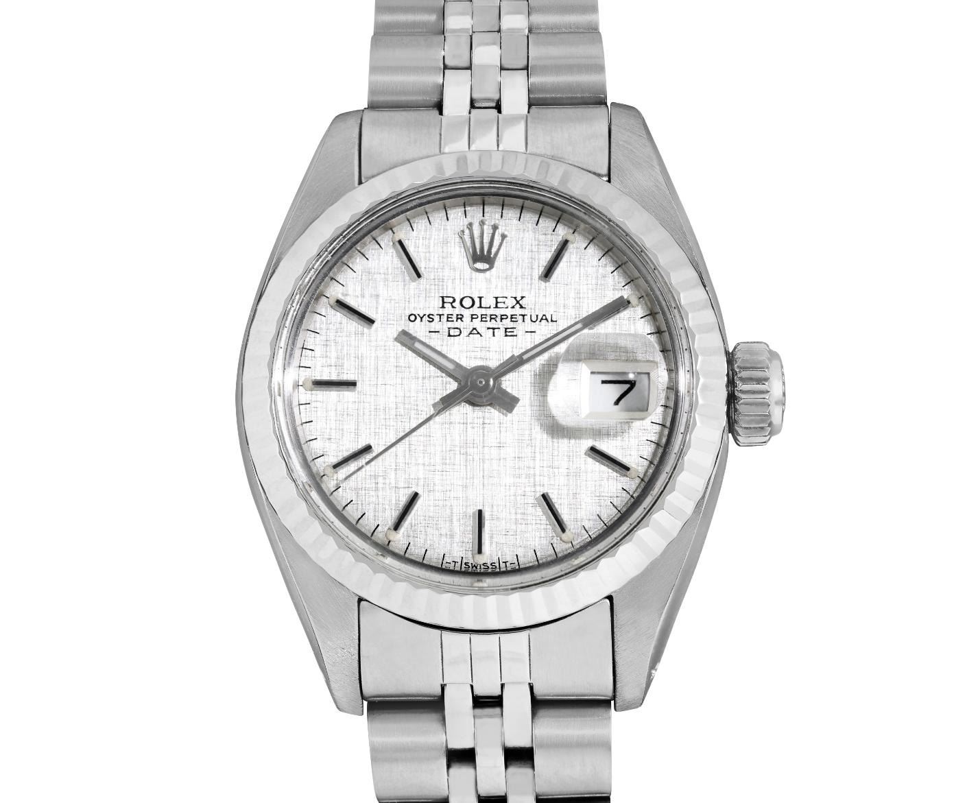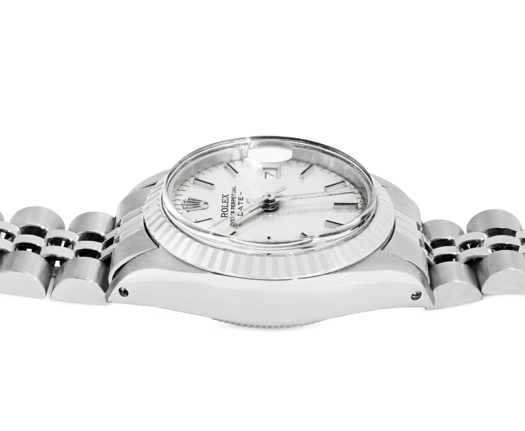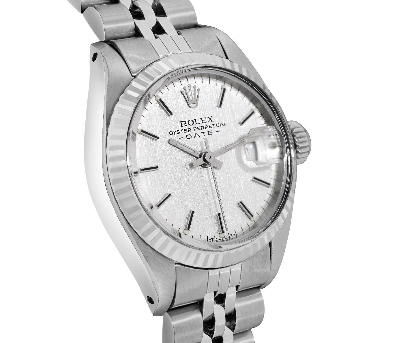This Lady Rolex Date watch features a silver linen dial with index hour markers and a custom plastic crystal, with a magnified date window. The timepiece has Rolex 14K white gold fluted bezel. The Rolex 26mm case is crafted from stainless steel and includes a Rolex screw-down crown. The bracelet is a Rolex stainless steel Jubilee band, designed to fit wrists up to 6 inches in circumference. The Watch Is Powered by the Rolex automatic self-winding Caliber 2035 movement. This watch has been polished and serviced and is in excellent condition. It will also be time tested before shipment.