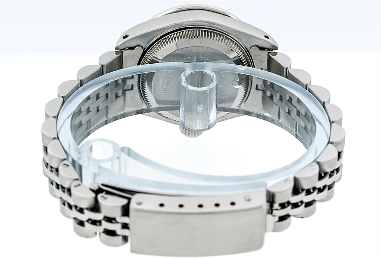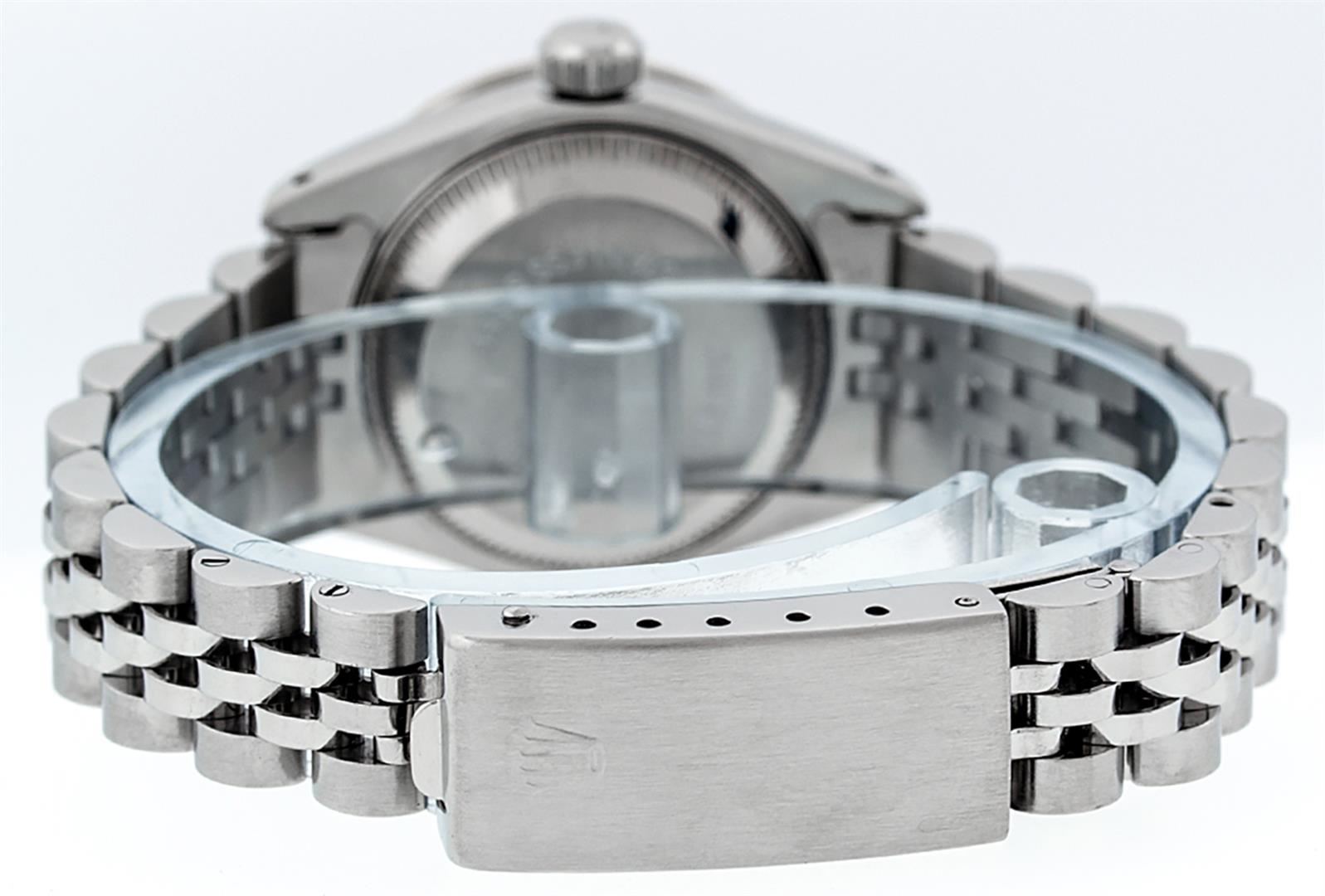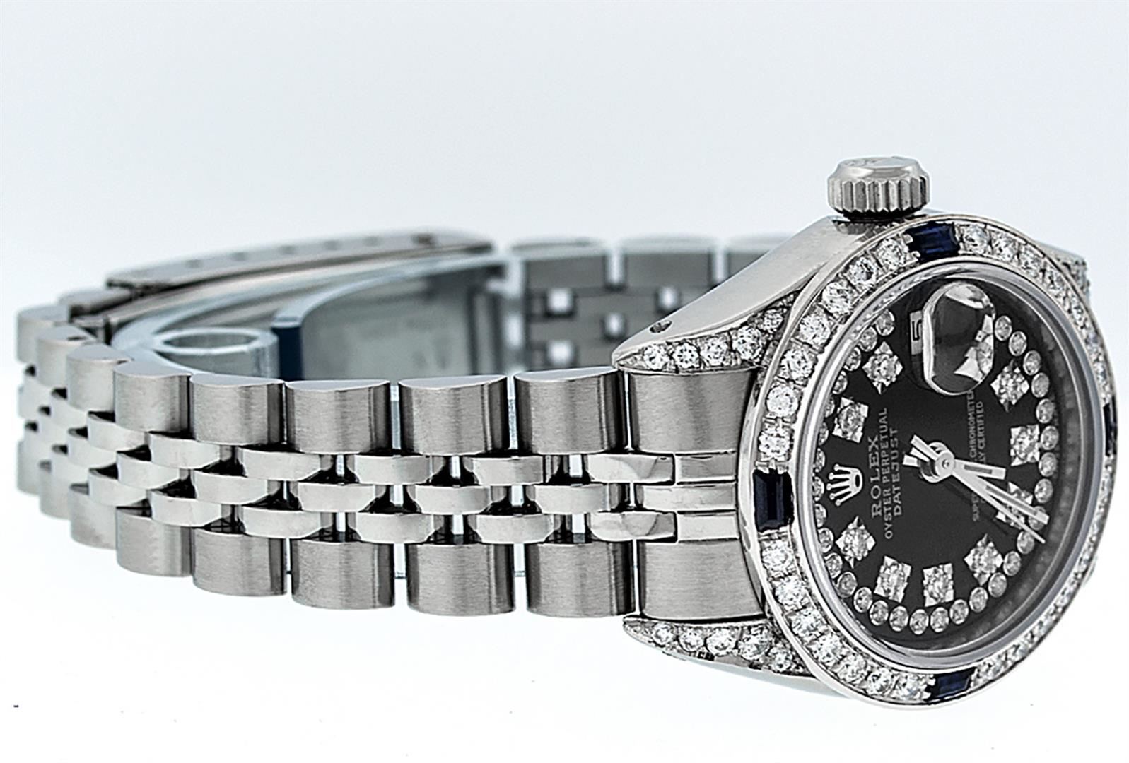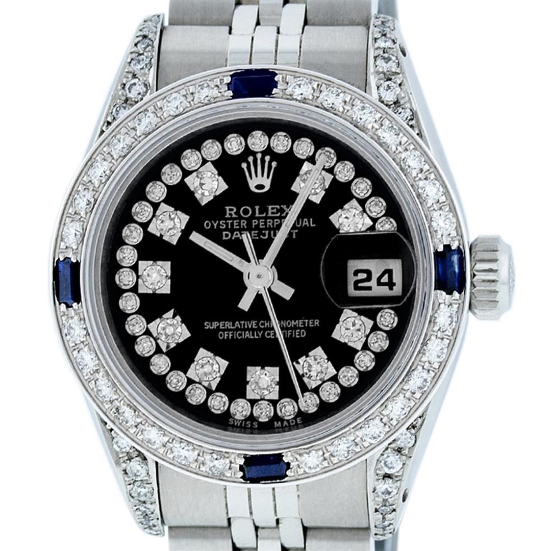 One Ladies Stainless Steel Rolex Datejust Polished Bright with Satin Finish, Serviced & Electronically Tested, Stainless Steel Case: 26mm, Stainless Steel Crown, Diamond Lugs: 24 Diamonds On Lugs, Clarity: SI-VS, Color: G to H. Custom Bezel: New 18K White Gold Diamond + Sapphire Beadset Diamond Bezel, Stone Count: 28 Diamonds + 4 Sapphires, Total Weight .70 Carat, Clarity: SI-VS, Color: G to H. Custom Crystal: New Synthetic Sapphire Cyclops Lens. Custom Hands: New Luminescent Hands. Movement: Automatic Winding Movement Caliber 2030. Custom Dial: Refinished Black String Diamond Dial, 43 Diamonds in Dial G To H In Color, Clarity: VS. Date Window: 3 O'Clock Position Date Display, Model: Datejust. Condition: G-6 Extra Fine. Bracelet: Stainless Steel Jubilee. Bright Polish & Satin Finish. 6.0 Inch Length, Adjustable. Standard Clasp, With Rolex Logo. This Watch Has Been Serviced Time Tested And Is In Excellent Condition It Is Free Of All Scratches And Dents.