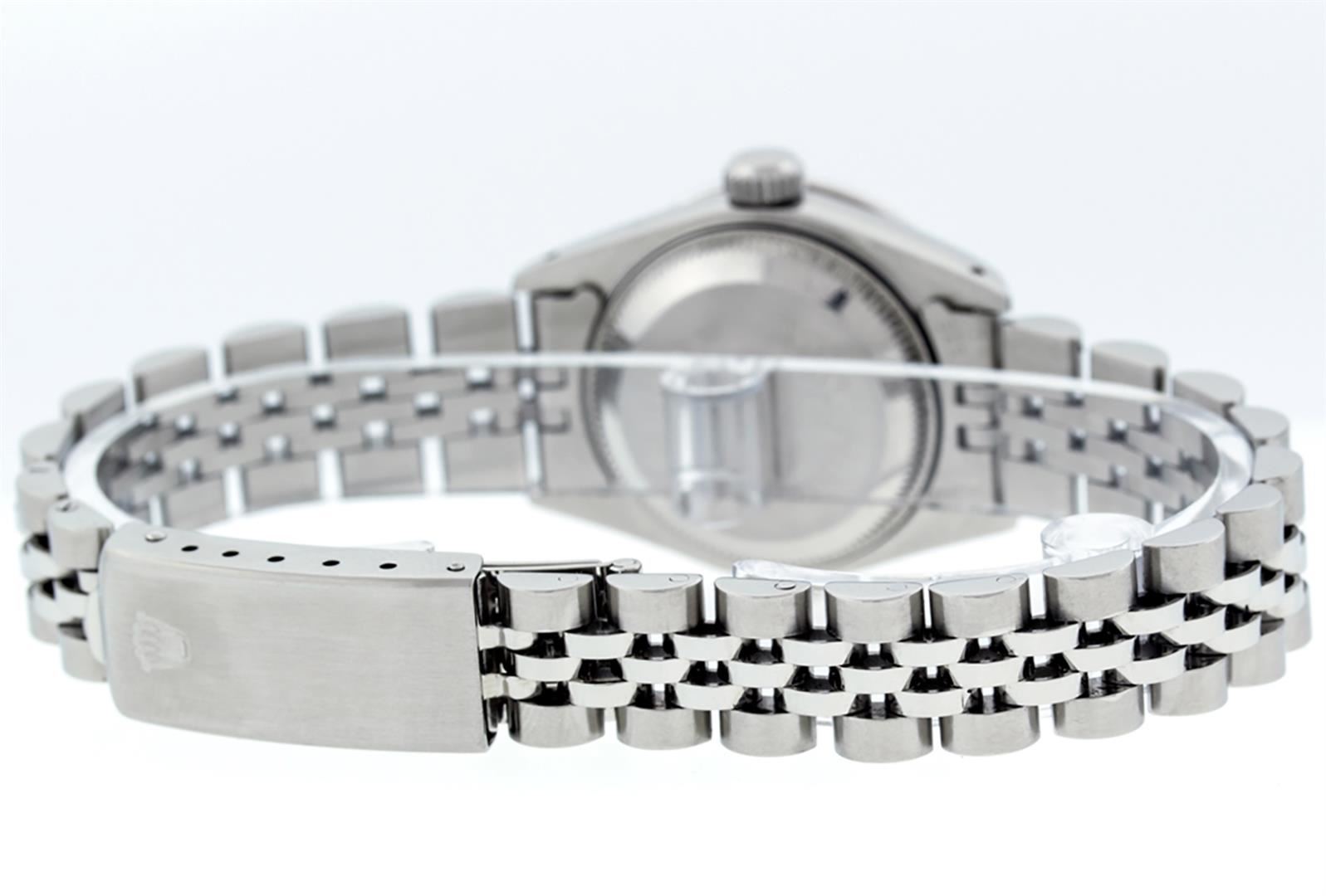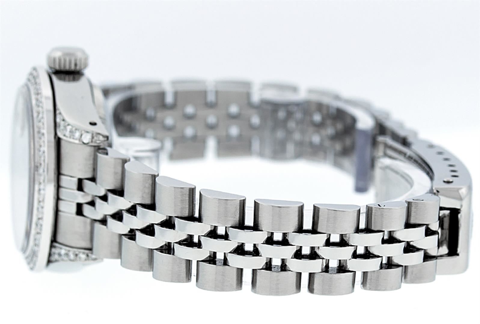One Ladies Stainless Steel Rolex Datejust Polished Bright with Satin Finish, Serviced & Electronically Tested, Stainless Steel Case: 26mm, Stainless Steel Crown, Custom Diamond Lugs: 24 Diamonds On Lugs, Clarity: SI-VS, Color: G to H. Custom Bezel: New 18K White Gold Diamond Beadset Diamond Bezel, Stone Count: 32 Diamonds In Bezel, Total Weight .70 Carat, Clarity: SI-VS, Color: G to H. Custom Crystal: New Scratch Resistant Synthetic Sapphire Cyclops Lens. Custom Hands: New Luminescent Hands. Movement: Automatic Winding Movement Caliber 2030. Custom Dial: Refinished Orange String Diamond Dial, 43 Diamonds in Dial G To H In Color, Clarity: VS. Date Window: 3 O'Clock Position Date Display, Model: Datejust. Condition: G-6 Extra Fine. Bracelet: Stainless Steel Jubilee Band. Bright Polish & Satin Finish. 6.0 Inch Length, Adjustable. Standard Clasp, With Rolex Logo. This Watch Has Been Serviced Time Tested And Is In Excellent Condition It Is Free Of All Scratches And Dents.