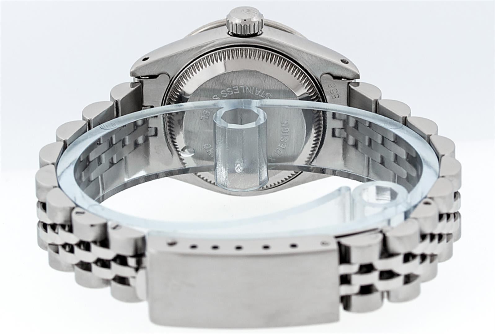 One Ladies Stainless Steel Rolex Datejust Polished Bright with Satin Finish, Serviced & Electronically Tested, Stainless Steel Case: 26mm, Stainless Steel Crown, Custom Diamond Lugs: 24 Diamonds On Lugs, Clarity: SI-VS, Color: G to H. Custom Bezel: New 18K White Gold Diamond Beadset Diamond Bezel, Stone Count: 32 Diamonds In Bezel, Total Weight .70 Carat, Clarity: SI-VS, Color: G to H. Custom Crystal: New Scratch Resistant Synthetic Sapphire Cyclops Lens. Custom Hands: New Luminescent Hands. Movement: Automatic Winding Movement . Custom Dial: Refinished Orange String Diamond Dial, 43 Diamonds in Dial G To H In Color, Clarity: VS. Date Window: 3 O'Clock Position Date Display, Model: Datejust. Condition: G-6 Extra Fine. Bracelet: Stainless Steel Jubilee Band. Bright Polish & Satin Finish. 6.0 Inch Length, Adjustable. Standard Clasp, With Rolex Logo. This Watch Has Been Serviced Time Tested And Is In Excellent Condition It Is Free Of All Scratches And Dents.