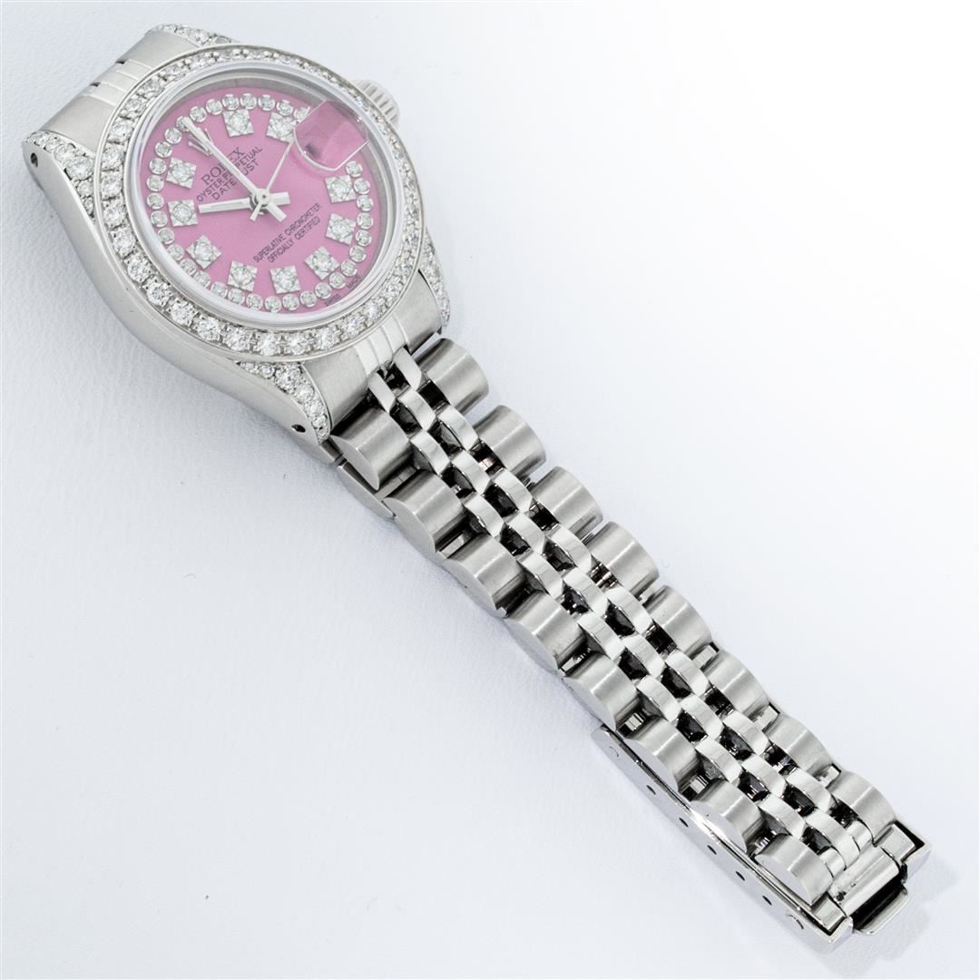 One Ladies Stainless Steel Rolex Datejust Polished Bright with Satin Finish, Serviced & Electronically Tested, Stainless Steel Case: 26mm, Stainless Steel Crown, Custom Diamond Lugs: 24 Diamonds On Lugs, Clarity: SI-VS, Color: G to H. Custom Bezel: New 18K White Gold Beadset Diamond Bezel, Stone Count: 32 Diamonds, Total Weight .70 Carat, Clarity: SI-VS, Color: G to H. Custom Crystal: New Scratch Resistant Synthetic Sapphire Cyclops Lens. Custom Hands: New Luminescent Hands. Movement: Automatic Winding Movement Caliber 2030. Custom Dial: Refinished Pink String Diamond Dial, 43 Diamonds in Dial G To H In Color, Clarity: VS. Date Window: 3 O'Clock Position Date Display, Model: Datejust. Condition: G-6 Extra Fine. Bracelet: Stainless Steel Jubilee Band. Bright Polish & Satin Finish. 6.0 Inch Length, Adjustable. Standard Clasp, With Rolex Logo. This Watch Has Been Serviced Time Tested And Is In Excellent Condition It Is Free Of All Scratches And Dents. This Watch Comes With A Rolex Box And Appraisal.