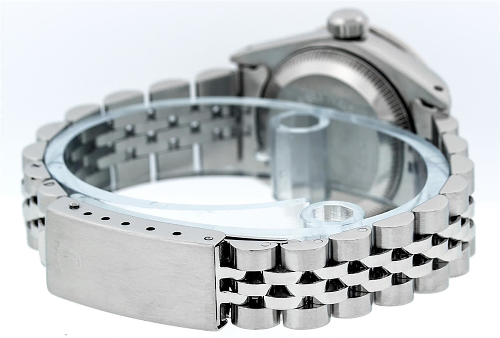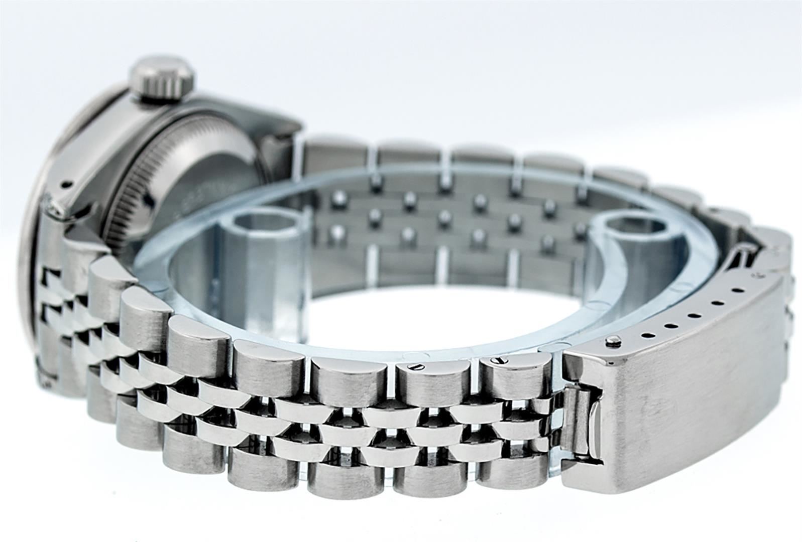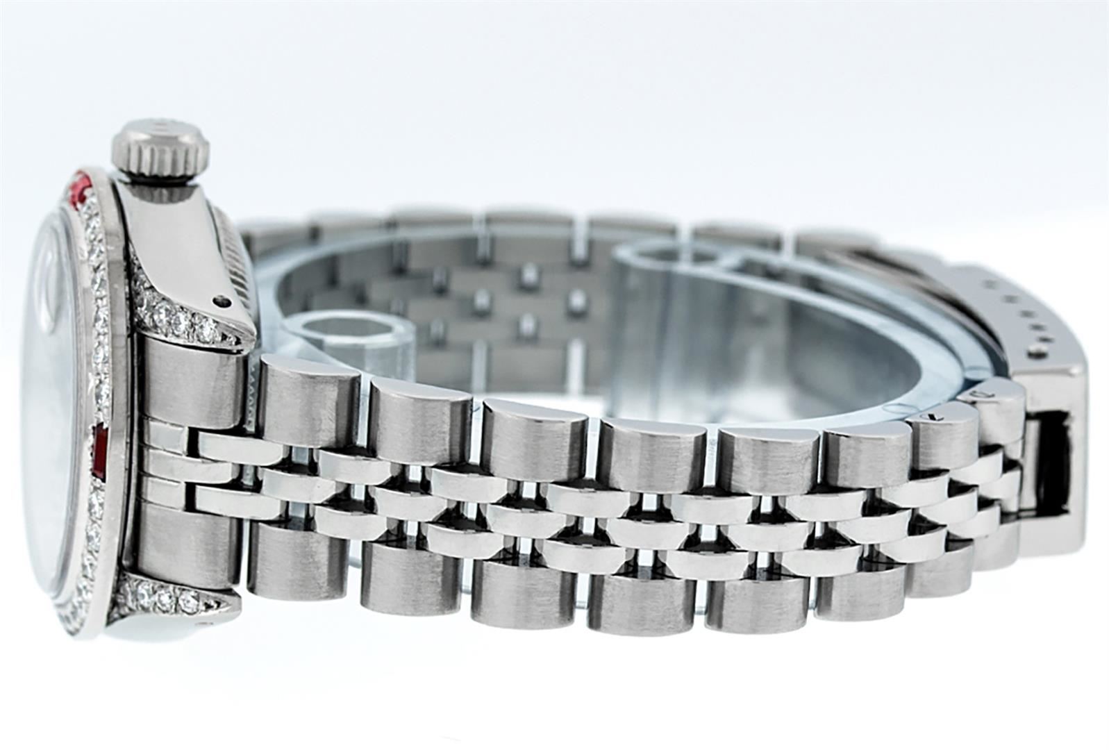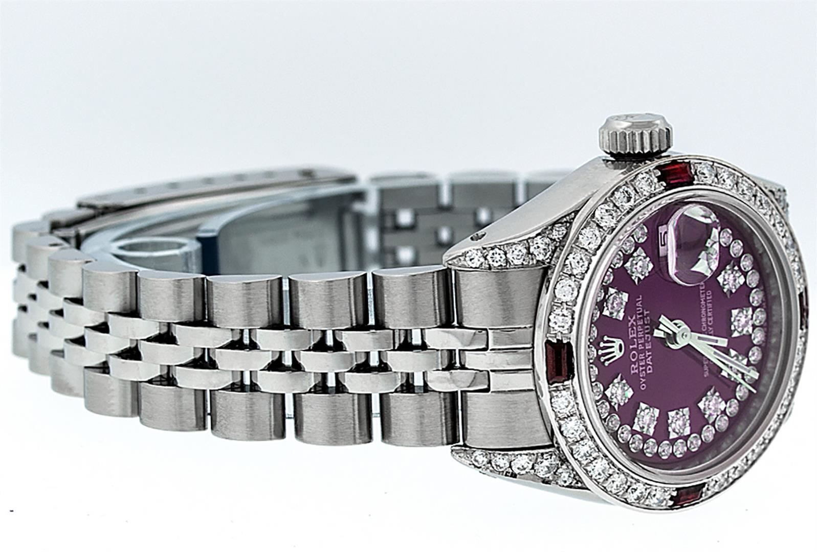 One Ladies Stainless Steel Rolex Datejust Polished Bright with Satin Finish, Serviced & Electronically Tested, Stainless Steel Case: 26mm, Stainless Steel Crown, Diamond Lugs: 24 Diamonds On Lugs, Clarity: SI-VS, Color: G to H. Custom Bezel: New 18K White Gold Diamond + Ruby Beadset Diamond Bezel, Stone Count: 28 Diamonds + 4 Rubies, Total Weight .70 Carat, Clarity: SI-VS, Color: G to H. Custom Crystal: New Scratch Resistant Synthetic Sapphire Cyclops Lens. Custom Hands: New Luminescent Hands. Movement: Automatic Winding Movement Caliber 2030. Custom Dial: Refinished Purple String Diamond Dial, 43 Diamonds in Dial G To H In Color, Clarity: VS. Date Window: 3 O'Clock Position Date Display, Model: Datejust. Condition: G-6 Extra Fine. Bracelet: Stainless Steel Jubilee. Bright Polish & Satin Finish. 6.0 Inch Length, Adjustable. Standard Clasp, With Rolex Logo. This Watch Has Been Serviced Time Tested And Is In Excellent Condition It Is Free Of All Scratches And Dents.