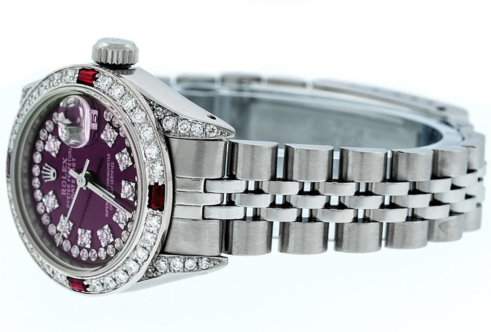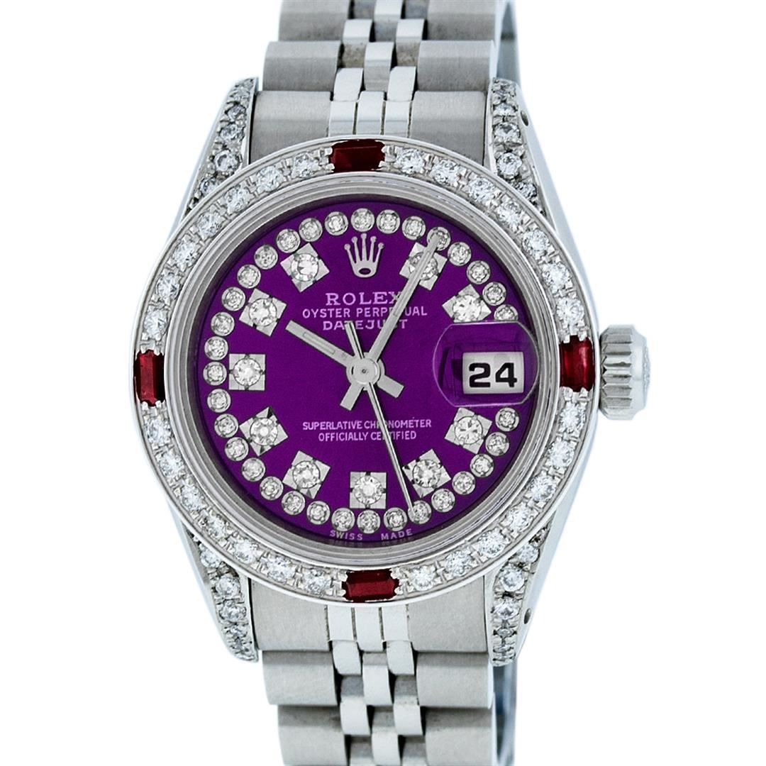 One Ladies Stainless Steel Rolex Datejust Polished Bright with Satin Finish, Serviced & Electronically Tested, Stainless Steel Case: 26mm, Stainless Steel Crown, Diamond Lugs: 24 Diamonds On Lugs, Clarity: SI-VS, Color: G to H. Custom Bezel: New 18K White Gold Diamond + Ruby Beadset Diamond Bezel, Stone Count: 28 Diamonds + 4 Rubies, Total Weight .70 Carat, Clarity: SI-VS, Color: G to H. Custom Crystal: New Scratch Resistant Synthetic Sapphire Cyclops Lens. Custom Hands: New Luminescent Hands. Movement: Automatic Winding Movement Caliber 2030. Custom Dial: Refinished Purple String Diamond Dial, 43 Diamonds in Dial G To H In Color, Clarity: VS. Date Window: 3 O'Clock Position Date Display, Model: Datejust. Condition: G-6 Extra Fine. Bracelet: Stainless Steel Jubilee. Bright Polish & Satin Finish. 6.0 Inch Length, Adjustable. Standard Clasp, With Rolex Logo. This Watch Has Been Serviced Time Tested And Is In Excellent Condition It Is Free Of All Scratches And Dents.