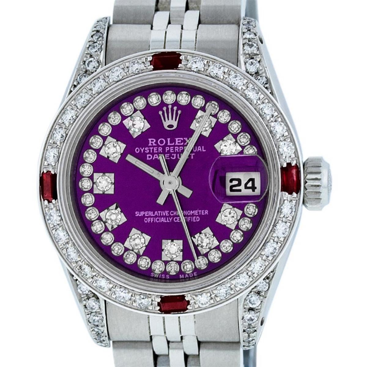 One Ladies Stainless Steel Rolex Datejust Polished Bright with Satin Finish, Serviced & Electronically Tested, Stainless Steel Case: 26mm, Stainless Steel Crown, Diamond Lugs: 24 Diamonds On Lugs, Clarity: SI-VS, Color: G to H. Custom Bezel: New 18K White Gold Diamond + Ruby Beadset Diamond Bezel, Stone Count: 28 Diamonds + 4 Rubies, Total Weight .70 Carat, Clarity: SI-VS, Color: G to H. Custom Crystal: New Scratch Resistant Synthetic Sapphire Cyclops Lens. Custom Hands: New Luminescent Hands. Movement: Automatic Winding Movement Caliber 2030. Custom Dial: Refinished Purple String Diamond Dial, 43 Diamonds in Dial G To H In Color, Clarity: VS. Date Window: 3 O'Clock Position Date Display, Model: Datejust. Condition: G-6 Extra Fine. Bracelet: Stainless Steel Jubilee. Bright Polish & Satin Finish. 6.0 Inch Length, Adjustable. Standard Clasp, With Rolex Logo. This Watch Has Been Serviced Time Tested And Is In Excellent Condition It Is Free Of All Scratches And Dents.