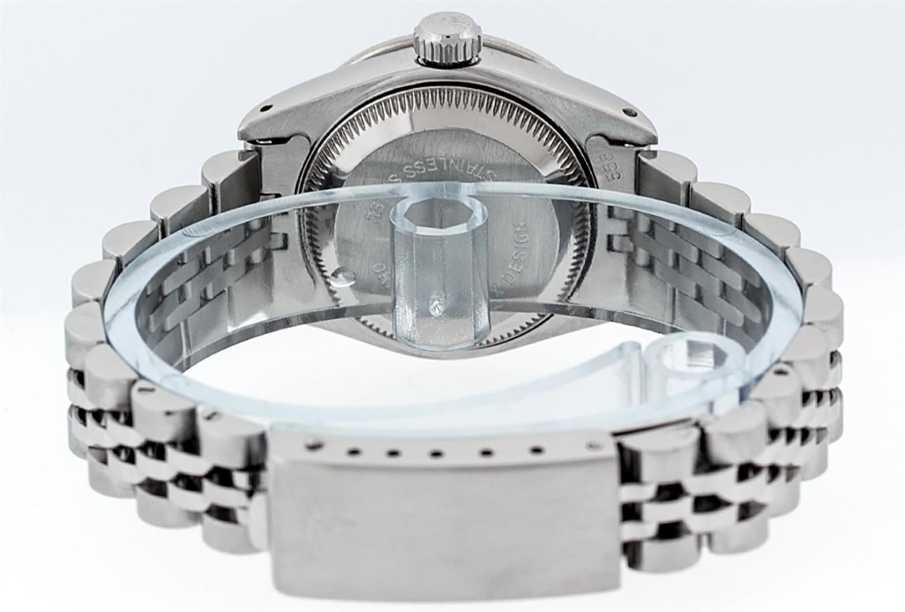 One Ladies Stainless Steel Rolex Datejust Polished Bright with Satin Finish, Serviced & Electronically Tested, Stainless Steel Case: 26mm, Stainless Steel Crown, Custom Diamond Lugs: 24 Diamonds On Lugs, Clarity: SI-VS, Color: G to H. Custom Bezel: New 18K White Gold Diamond Beadset Diamond Bezel, Stone Count:�32 Diamonds, Total Weight .70 Carat, Clarity: SI-VS, Color: G to H. Custom Crystal: New Scratch Resistant Synthetic Sapphire Cyclops Lens. Custom Hands: New Luminescent Hands. Movement: Automatic Winding Movement Caliber 2030.�Custom Dial: Refinished Salmon String Diamond Dial, 43 Diamonds in Dial G To H In Color, Clarity: VS. Date Window: 3 O'Clock Position Date Display, Model: Datejust. Condition: G-6 Extra Fine. Bracelet: Stainless Steel Jubilee Band. Bright Polish & Satin Finish. 6.0 Inch Length, Adjustable. Standard Clasp, With Rolex Logo. This Watch Has Been Serviced Time Tested And Is In Excellent Condition It Is Free Of All Scratches And Dents.
