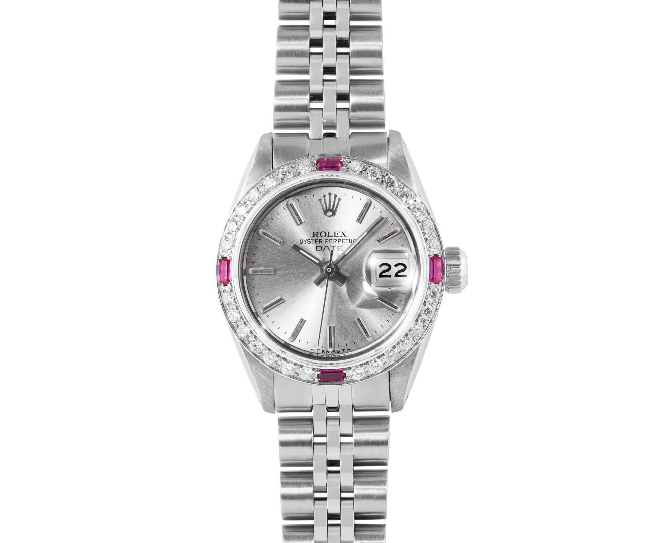 One Rolex Ladies Pre Owned Stainless Steel Date Wristwatch Polished Bright with Satin Finish, Serviced And Electronically Tested, Stainless Steel Case: 26mm, Stainless Steel Crown, Custom Bezel: New 18K White Gold Ruby Beadset Diamond Bezel, Diamond + Gem Count: 36 Diamonds + 4 Rubies. Custom Crystal: New Sapphire With Magnified Date Window. Custom Hands: New Luminescent Hands. Rolex Movement: Automatic Winding Movement 2035. Rolex Dial: Factory Silver Dial With Index Hour Markers and Lumi Markers, Dash Track, and Lumi Dots. Date Window: 3 O'Clock Position Date Display, Model: Date. Condition: G-6 Extra Fine. Rolex Bracelet: Stainless Steel Jubilee Band. Bright Polish & Satin Finish. 6.0 Inch Length, Adjustable. Standard Clasp, With Rolex Logo. This Watch Has Been Serviced Time Tested And Is In Excellent Condition. It Is Free Of All Scratches And Dents.