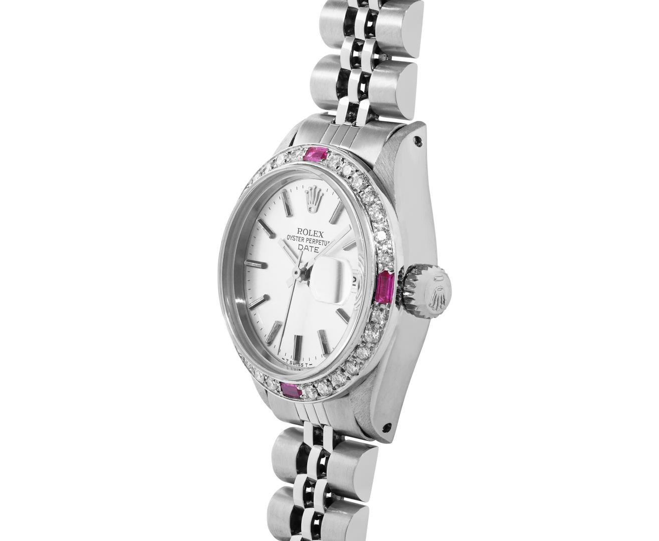 One Rolex Ladies Pre Owned Stainless Steel Date Wristwatch Polished Bright with Satin Finish, Serviced And Electronically Tested, Stainless Steel Case: 26mm, Stainless Steel Crown, Custom Bezel: New 18K White Gold Ruby Beadset Diamond Bezel, Diamond + Gem Count: 36 Diamonds + 4 Rubies. Custom Crystal: New Sapphire With Magnified Date Window. Custom Hands: New Luminescent Hands. Rolex Movement: Automatic Winding Movement 2035. Rolex Dial: Factory Silver Dial With Index Hour Markers and Lumi Markers, Dash Track, and Lumi Dots. Date Window: 3 O'Clock Position Date Display, Model: Date. Condition: G-6 Extra Fine. Rolex Bracelet: Stainless Steel Jubilee Band. Bright Polish & Satin Finish. 6.0 Inch Length, Adjustable. Standard Clasp, With Rolex Logo. This Watch Has Been Serviced Time Tested And Is In Excellent Condition. It Is Free Of All Scratches And Dents.