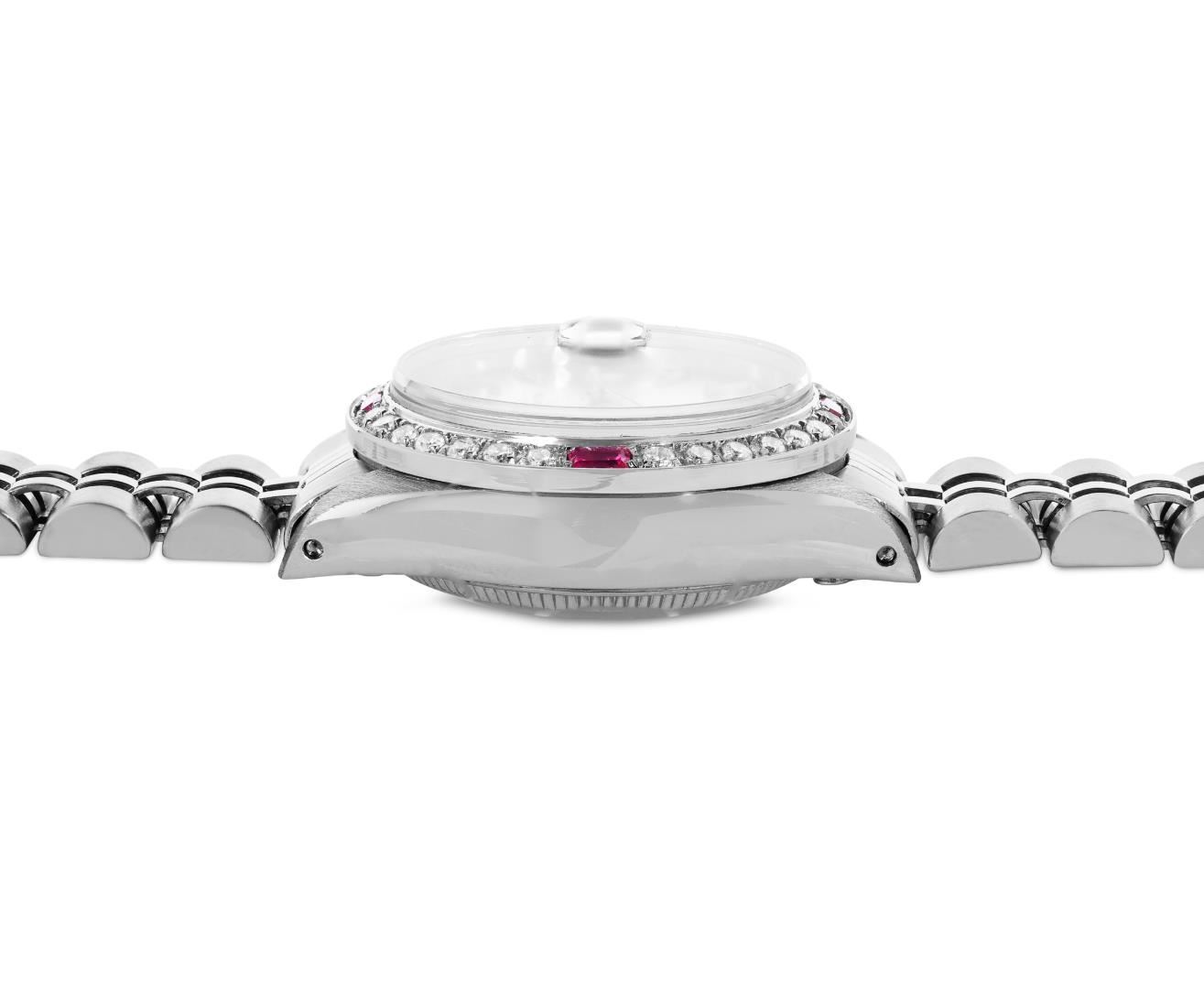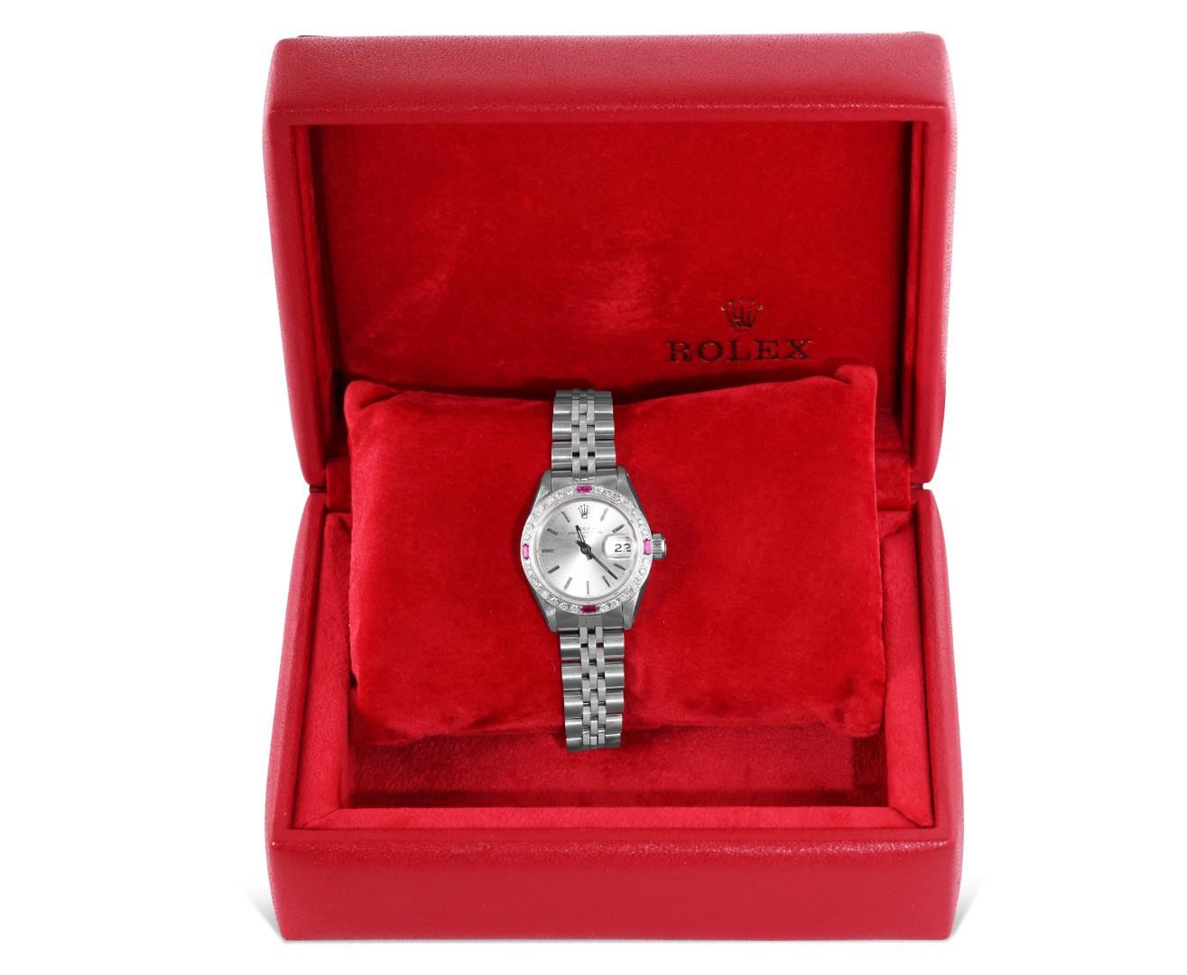 One Rolex Ladies Pre Owned Stainless Steel Date Wristwatch Polished Bright with Satin Finish, Serviced And Electronically Tested, Stainless Steel Case: 26mm, Stainless Steel Crown, Custom Bezel: New 18K White Gold Ruby Beadset Diamond Bezel, Diamond + Gem Count: 36 Diamonds + 4 Rubies. Custom Crystal: New Sapphire With Magnified Date Window. Custom Hands: New Luminescent Hands. Rolex Movement: Automatic Winding Movement 2035. Rolex Dial: Factory Silver Dial With Index Hour Markers and Lumi Markers, Dash Track, and Lumi Dots. Date Window: 3 O'Clock Position Date Display, Model: Date. Condition: G-6 Extra Fine. Rolex Bracelet: Stainless Steel Jubilee Band. Bright Polish & Satin Finish. 6.0 Inch Length, Adjustable. Standard Clasp, With Rolex Logo. This Watch Has Been Serviced Time Tested And Is In Excellent Condition. It Is Free Of All Scratches And Dents.