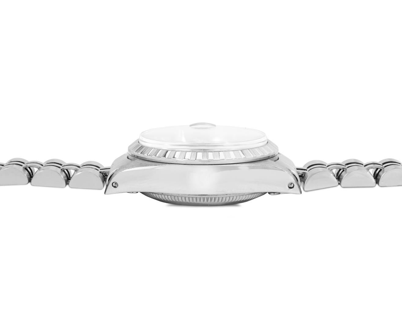 One Rolex Ladies Pre Owned Stainless Steel Date Wristwatch Polished Bright with Satin Finish, Serviced And Electronically Tested, Stainless Steel Case: 26mm, Stainless Steel Crown, Stainless Steel Engine Turn Bezel, Custom Crystal: New Acrylic With Magnifying Date Window. Custom Hands: New Luminescent Hands. Rolex Movement: Automatic Winding Movement 2035. Rolex Dial: Factory Silver With Index Hour Markers And Lumi Dots. Date Window: 3 O'Clock Position Date Display, Model: Datejust. Condition: G-6 Extra Fine. Rolex Bracelet: Stainless Steel Jubilee Band. Bright Polish & Satin Finish. 6.0 Inch Length, Adjustable. Standard Clasp, With Rolex Logo. This Watch Has Been Serviced Time Tested And Is In Excellent Condition. It Is Free Of All Scratches And Dents. This Watch Comes With A Rolex Box.