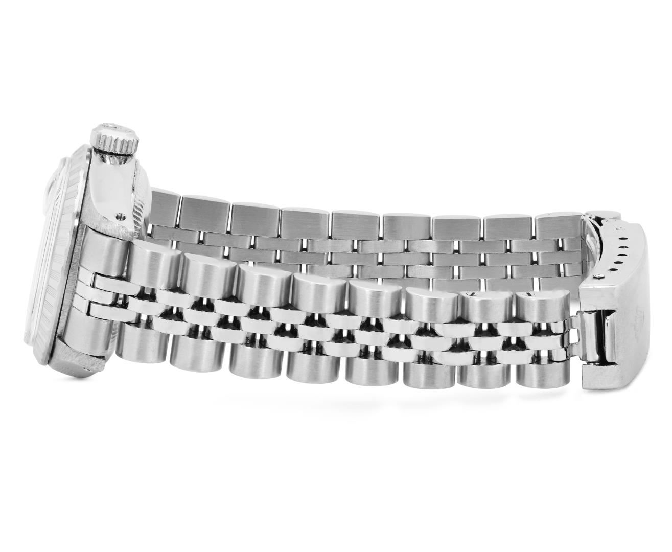 One Rolex Ladies Pre Owned Stainless Steel Date Wristwatch Polished Bright with Satin Finish, Serviced And Electronically Tested, Stainless Steel Case: 26mm, Stainless Steel Crown, Stainless Steel Engine Turn Bezel, Custom Crystal: New Acrylic With Magnifying Date Window. Custom Hands: New Luminescent Hands. Rolex Movement: Automatic Winding Movement 2035. Rolex Dial: Factory Silver With Index Hour Markers And Lumi Dots. Date Window: 3 O'Clock Position Date Display, Model: Datejust. Condition: G-6 Extra Fine. Rolex Bracelet: Stainless Steel Jubilee Band. Bright Polish & Satin Finish. 6.0 Inch Length, Adjustable. Standard Clasp, With Rolex Logo. This Watch Has Been Serviced Time Tested And Is In Excellent Condition. It Is Free Of All Scratches And Dents. This Watch Comes With A Rolex Box.