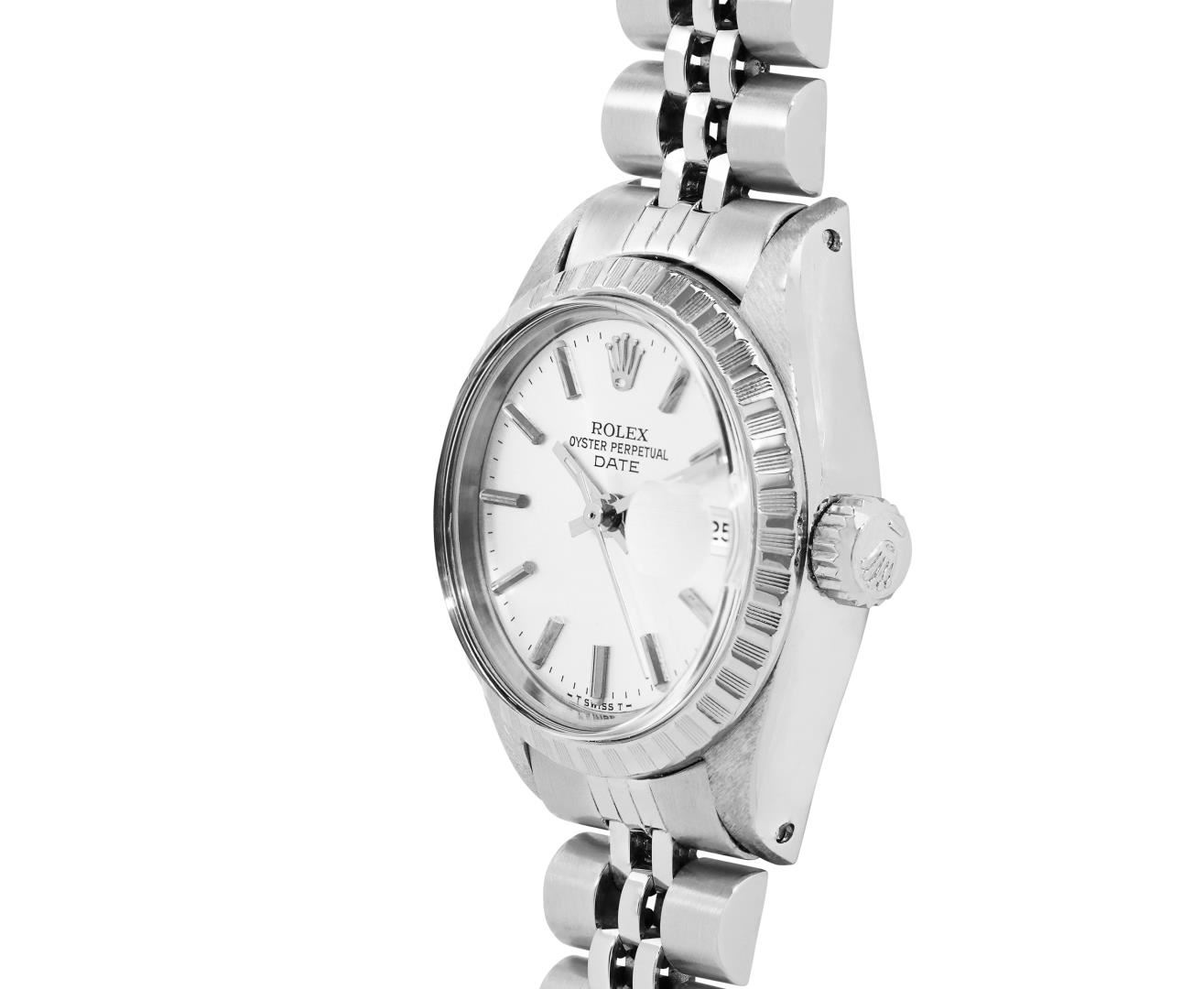 One Rolex Ladies Pre Owned Stainless Steel Date Wristwatch Polished Bright with Satin Finish, Serviced And Electronically Tested, Stainless Steel Case: 26mm, Stainless Steel Crown, Stainless Steel Engine Turn Bezel, Custom Crystal: New Acrylic With Magnifying Date Window. Custom Hands: New Luminescent Hands. Rolex Movement: Automatic Winding Movement 2035. Rolex Dial: Factory Silver With Index Hour Markers And Lumi Dots. Date Window: 3 O'Clock Position Date Display, Model: Datejust. Condition: G-6 Extra Fine. Rolex Bracelet: Stainless Steel Jubilee Band. Bright Polish & Satin Finish. 6.0 Inch Length, Adjustable. Standard Clasp, With Rolex Logo. This Watch Has Been Serviced Time Tested And Is In Excellent Condition. It Is Free Of All Scratches And Dents. This Watch Comes With A Rolex Box.