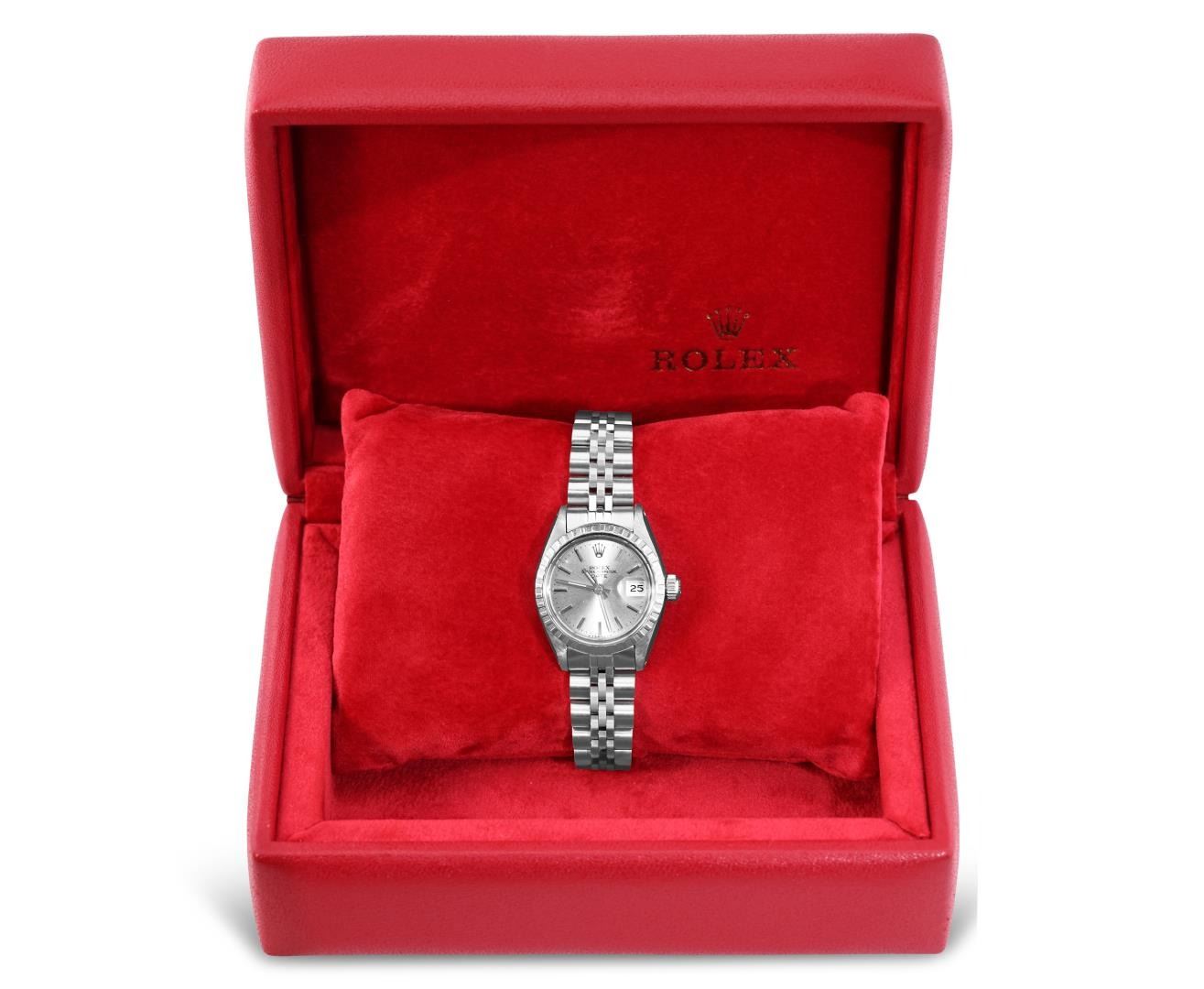 One Rolex Ladies Pre Owned Stainless Steel Date Wristwatch Polished Bright with Satin Finish, Serviced And Electronically Tested, Stainless Steel Case: 26mm, Stainless Steel Crown, Stainless Steel Engine Turn Bezel, Custom Crystal: New Acrylic With Magnifying Date Window. Custom Hands: New Luminescent Hands. Rolex Movement: Automatic Winding Movement 2035. Rolex Dial: Factory Silver With Index Hour Markers And Lumi Dots. Date Window: 3 O'Clock Position Date Display, Model: Datejust. Condition: G-6 Extra Fine. Rolex Bracelet: Stainless Steel Jubilee Band. Bright Polish & Satin Finish. 6.0 Inch Length, Adjustable. Standard Clasp, With Rolex Logo. This Watch Has Been Serviced Time Tested And Is In Excellent Condition. It Is Free Of All Scratches And Dents. This Watch Comes With A Rolex Box.