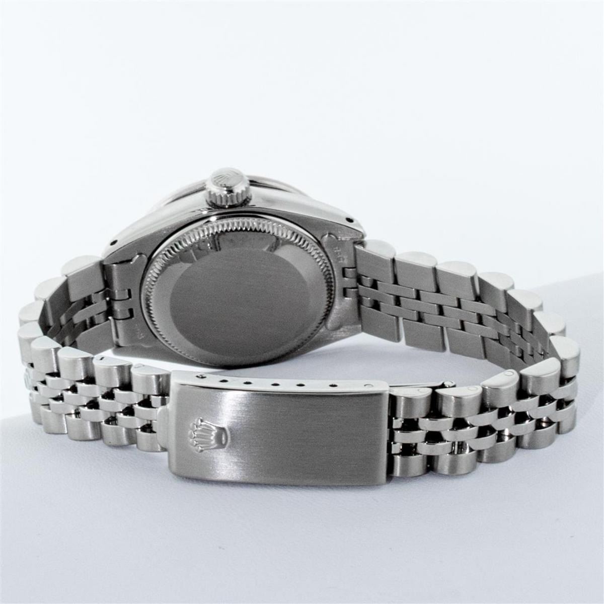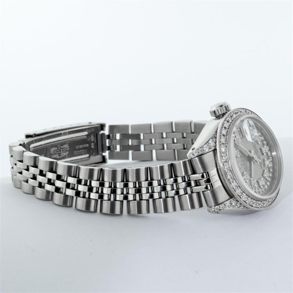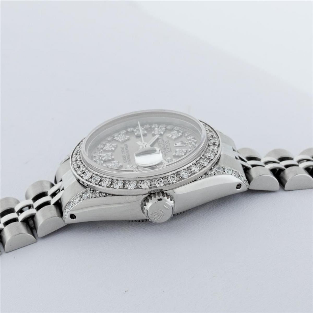 One Ladies Stainless Steel Rolex Datejust Polished Bright with Satin Finish, Serviced & Electronically Tested, Stainless Steel Case: 26mm, Stainless Steel Crown, Custom Diamond Lugs: 24 Diamonds On Lugs, Clarity: SI-VS, Color: G to H. Custom Bezel: New 18K White Gold Beadset Diamond Bezel, Stone Count: 32 Diamonds, Total Weight .70 Carat, Clarity: SI-VS, Color: G to H. Custom Crystal: New Scratch Resistant Synthetic Sapphire Cyclops Lens. Custom Hands: New Luminescent Hands. Movement: Automatic Winding Movement Caliber 2030. Custom Dial: Refinished Slate Grey String Diamond Dial, 43 Diamonds in Dial, G To H In Color, Clarity: VS. Date Window: 3 O'Clock Position Date Display, Model: Datejust. Condition: G-6 Extra Fine. Bracelet: Stainless Steel Jubilee Band. Bright Polish & Satin Finish. 6.0 Inch Length, Adjustable. Standard Clasp, With Rolex Logo. This Watch Has Been Serviced Time Tested And Is In Excellent Condition It Is Free Of All Scratches And Dents. This Watch Comes With A Rolex Box And Appraisal.