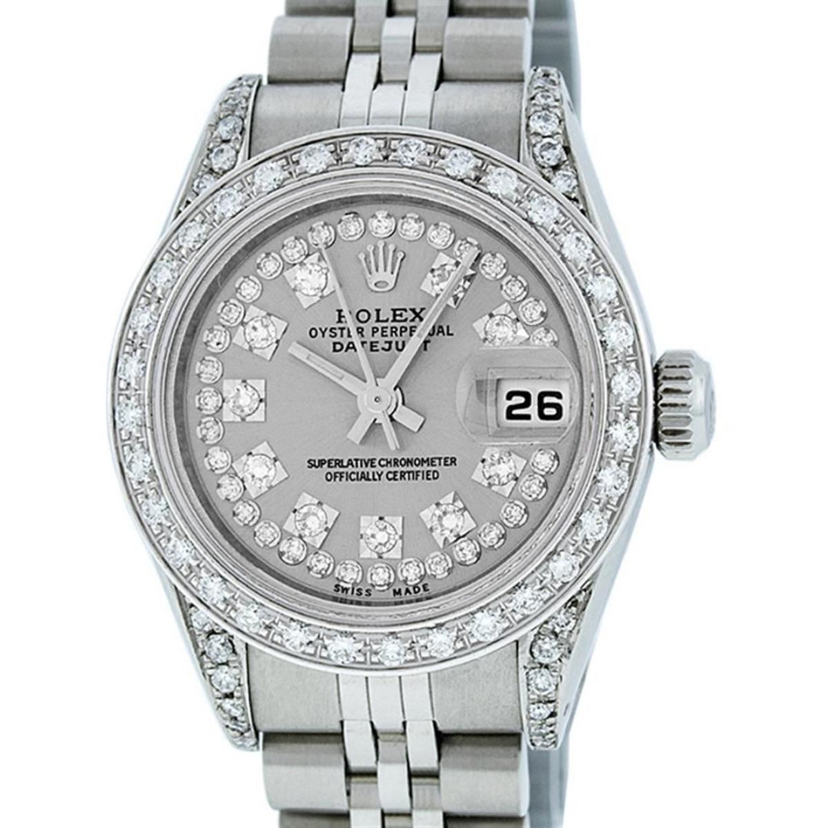 One Ladies Stainless Steel Rolex Datejust Polished Bright with Satin Finish, Serviced & Electronically Tested, Stainless Steel Case: 26mm, Stainless Steel Crown, Custom Diamond Lugs: 24 Diamonds On Lugs, Clarity: SI-VS, Color: G to H. Custom Bezel: New 18K White Gold Beadset Diamond Bezel, Stone Count: 32 Diamonds, Total Weight .70 Carat, Clarity: SI-VS, Color: G to H. Custom Crystal: New Scratch Resistant Synthetic Sapphire Cyclops Lens. Custom Hands: New Luminescent Hands. Movement: Automatic Winding Movement. Custom Dial: Refinished Slate Grey String Diamond Dial, 43 Diamonds in Dial, G To H In Color, Clarity: VS. Date Window: 3 O'Clock Position Date Display, Model: Datejust. Condition: G-6 Extra Fine. Bracelet: Stainless Steel Jubilee Band. Bright Polish & Satin Finish. 6.0 Inch Length, Adjustable. Standard Clasp, With Rolex Logo. This Watch Has Been Serviced Time Tested And Is In Excellent Condition It Is Free Of All Scratches And Dents.