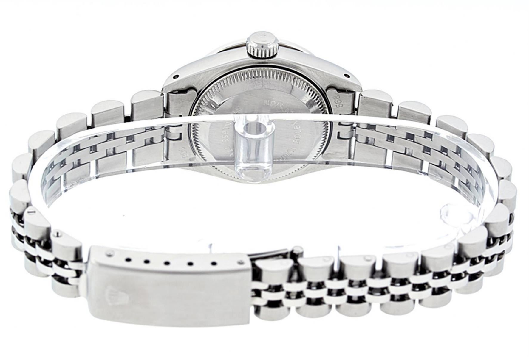 One Ladies Stainless Steel Rolex Datejust Polished Bright with Satin Finish, Serviced & Electronically Tested, Stainless Steel Case: 26mm, Stainless Steel Crown, Custom Diamond Lugs: 24 Diamonds On Lugs, Clarity: SI-VS, Color: G to H. Custom Bezel: New 18K White Gold Beadset Diamond Bezel, Stone Count: 32 Diamonds, Total Weight .70 Carat, Clarity: SI-VS, Color: G to H. Custom Crystal: New Scratch Resistant Synthetic Sapphire Cyclops Lens. Custom Hands: New Luminescent Hands. Movement: Automatic Winding Movement . Custom Dial: Refinished Slate Grey String Diamond Dial, 43 Diamonds in Dial, G To H In Color, Clarity: VS. Date Window: 3 O'Clock Position Date Display, Model: Datejust. Condition: G-6 Extra Fine. Bracelet: Stainless Steel Jubilee Band. Bright Polish & Satin Finish. 6.0 Inch Length, Adjustable. Standard Clasp, With Rolex Logo. This Watch Has Been Serviced Time Tested And Is In Excellent Condition It Is Free Of All Scratches And Dents.