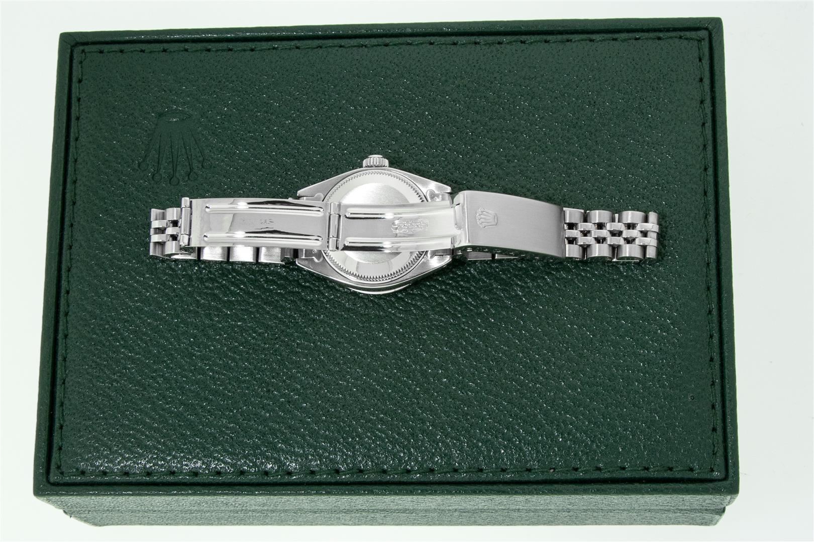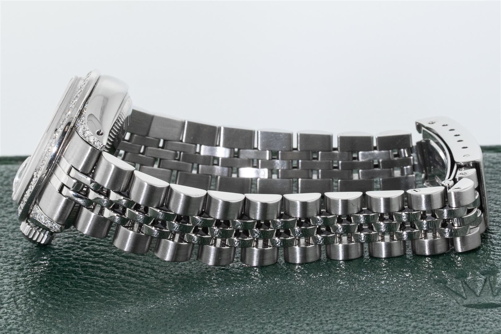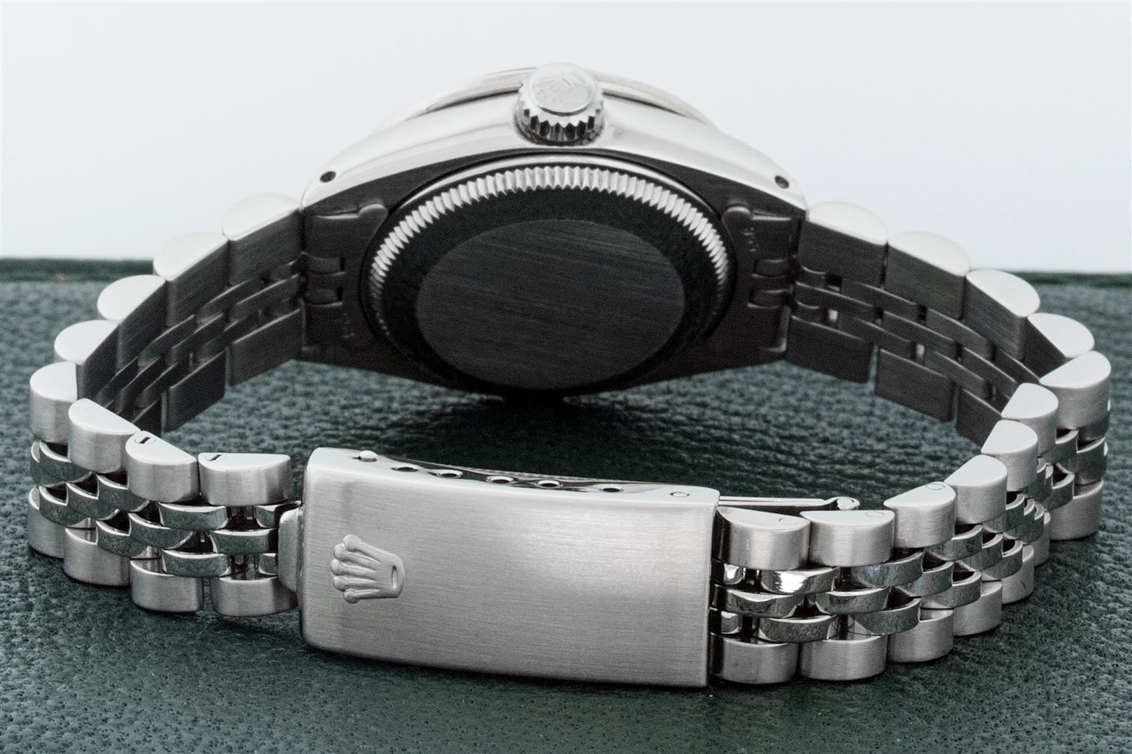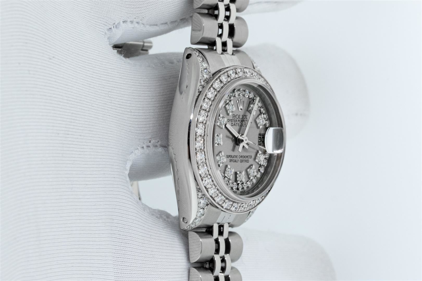 One Ladies Stainless Steel Rolex Datejust Polished Bright with Satin Finish, Serviced & Electronically Tested, Stainless Steel Case: 26mm, Stainless Steel Crown, Custom Diamond Lugs: 24 Diamonds On Lugs, Clarity: SI-VS, Color: G to H. Custom Bezel: New 18K White Gold Beadset Diamond Bezel, Stone Count: 32 Diamonds, Total Weight .70 Carat, Clarity: SI-VS, Color: G to H. Custom Crystal: New Scratch Resistant Synthetic Sapphire Cyclops Lens. Custom Hands: New Luminescent Hands. Movement: Automatic Winding Movement . Custom Dial: Refinished Slate Grey String Diamond Dial, 43 Diamonds in Dial, G To H In Color, Clarity: VS. Date Window: 3 O'Clock Position Date Display, Model: Datejust. Condition: G-6 Extra Fine. Bracelet: Stainless Steel Jubilee Band. Bright Polish & Satin Finish. 6.0 Inch Length, Adjustable. Standard Clasp, With Rolex Logo. This Watch Has Been Serviced Time Tested And Is In Excellent Condition It Is Free Of All Scratches And Dents. This Watch Comes With A Rolex Box.
