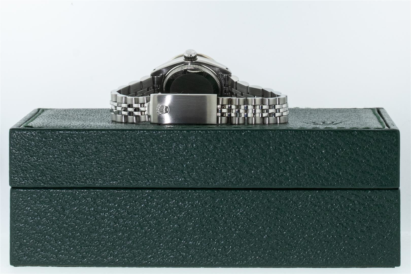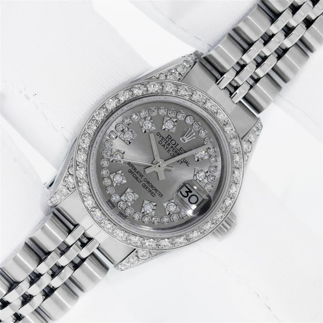 One Ladies Stainless Steel Rolex Datejust Polished Bright with Satin Finish, Serviced & Electronically Tested, Stainless Steel Case: 26mm, Stainless Steel Crown, Custom Diamond Lugs: 24 Diamonds On Lugs, Clarity: SI-VS, Color: G to H. Custom Bezel: New 18K White Gold Beadset Diamond Bezel, Stone Count: 32 Diamonds, Total Weight .70 Carat, Clarity: SI-VS, Color: G to H. Custom Crystal: New Scratch Resistant Synthetic Sapphire Cyclops Lens. Custom Hands: New Luminescent Hands. Movement: Automatic Winding Movement . Custom Dial: Refinished Slate Grey String Diamond Dial, 43 Diamonds in Dial, G To H In Color, Clarity: VS. Date Window: 3 O'Clock Position Date Display, Model: Datejust. Condition: G-6 Extra Fine. Bracelet: Stainless Steel Jubilee Band. Bright Polish & Satin Finish. 6.0 Inch Length, Adjustable. Standard Clasp, With Rolex Logo. This Watch Has Been Serviced Time Tested And Is In Excellent Condition It Is Free Of All Scratches And Dents. This Watch Comes With A Rolex Box.