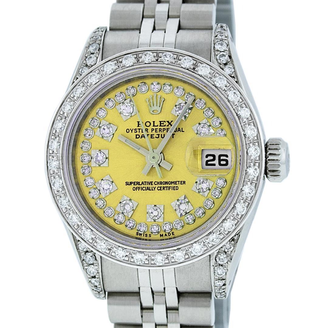 One Ladies Stainless Steel Rolex Datejust Polished Bright with Satin Finish, Serviced & Electronically Tested, Stainless Steel Case: 26mm, Stainless Steel Crown, Custom Diamond Lugs: 24 Diamonds On Lugs, Clarity: SI-VS, Color: G to H. Custom Bezel: New 18K White Gold Beadset Diamond Bezel, Stone Count: 32 Diamonds, Total Weight .70 Carat, Clarity: SI-VS, Color: G to H. Custom Crystal: New Scratch Resistant Synthetic Sapphire Cyclops Lens. Custom Hands: New Luminescent Hands. Movement: Automatic Winding Movement . Custom Dial: Refinished Yellow String Diamond Dial, 43 Diamonds in Dial G To H In Color, Clarity: VS. Date Window: 3 O'Clock Position Date Display, Model: Datejust. Condition: G-6 Extra Fine. Bracelet: Stainless Steel Jubilee Band. Bright Polish & Satin Finish. 6.0 Inch Length, Adjustable. Standard Clasp, With Rolex Logo. This Watch Has Been Serviced Time Tested And Is In Excellent Condition It Is Free Of All Scratches And Dents.