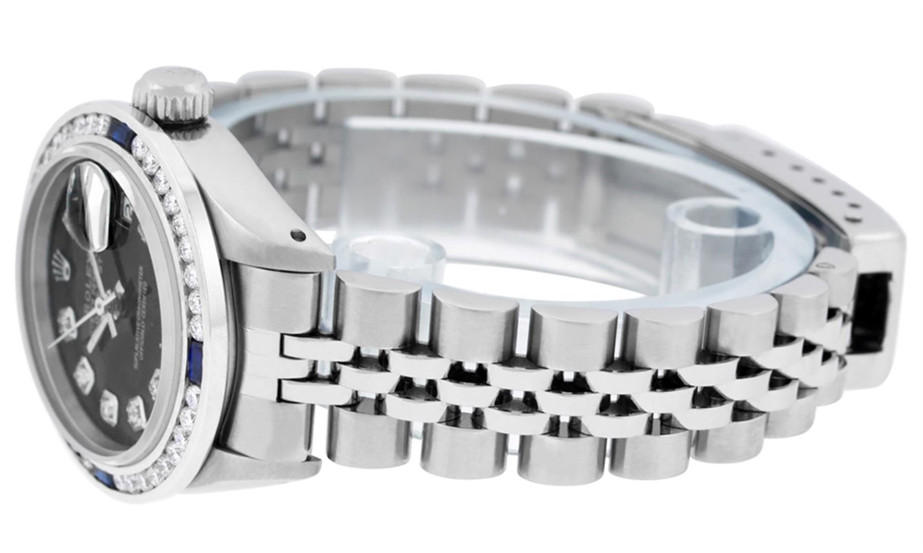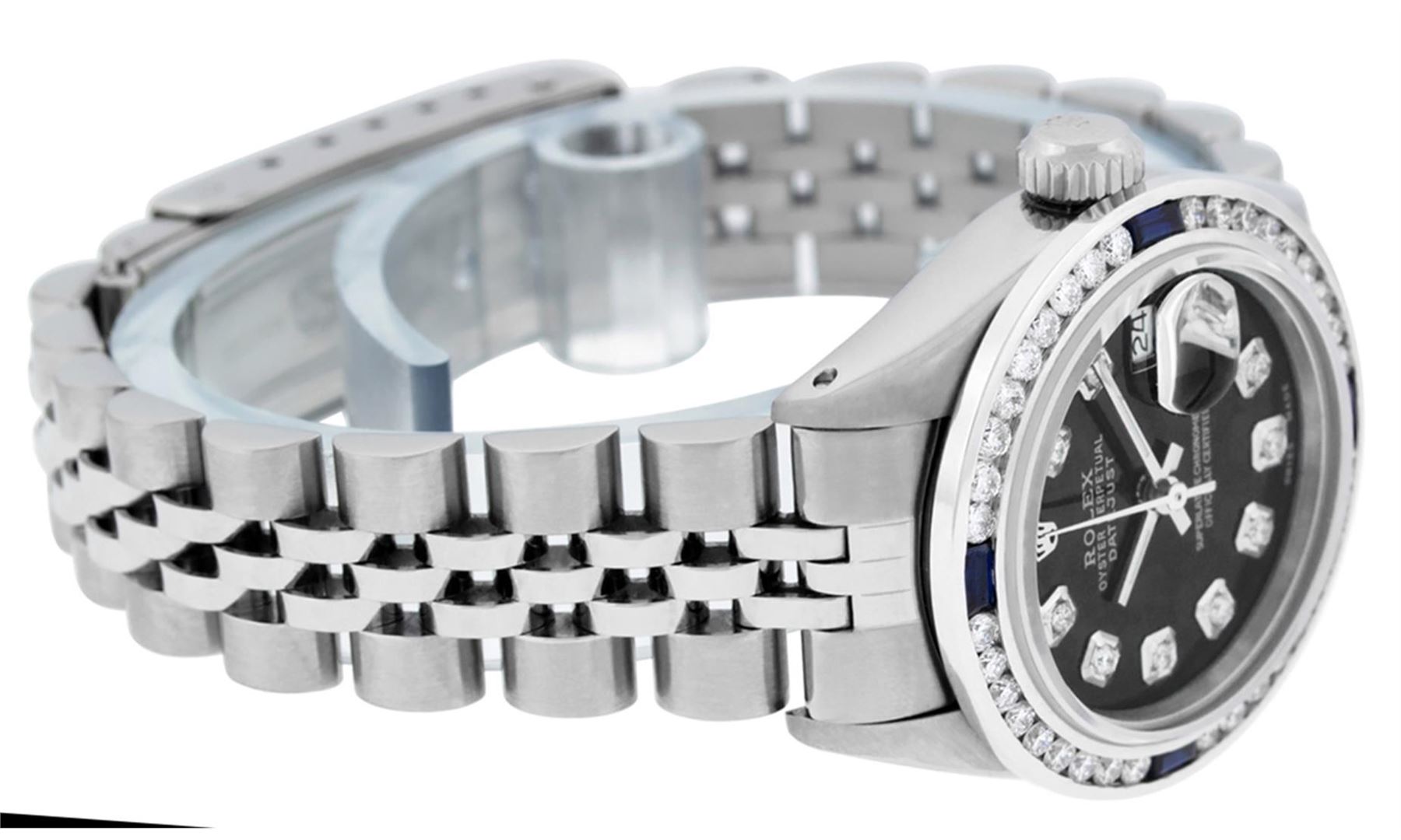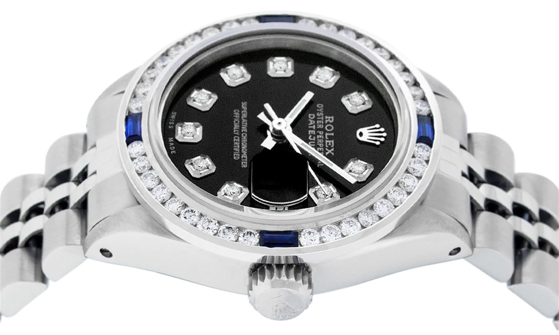 One Ladies Rolex Stainless Pre Owned Steel Wristwatch Polished Bright with Satin Finish, Serviced & Electronically Tested, Stainless Steel Case: 26mm, Stainless Steel Crown, Custom Bezel: New 18K White Gold Sapphire Channel Set Diamond Bezel, Diamond + Gem Count: 36 Diamonds + 4 Sapphires. Custom Crystal: New Sapphire With Date Window. Custom Hands: New Luminescent Hands. Rolex Movement: Automatic Winding Movement 2035. Custom Dial: Custom Black With Added Diamond Hour Markers. Date Window: 3 O'Clock Position Date Display. Condition: G-6 Extra Fine. Rolex Bracelet: Stainless Steel Jubilee Band. Bright Polish & Satin Finish. 6.0 Inch Length, Adjustable. Standard Clasp, With Rolex Logo. This Watch Has Been Serviced Time Tested And Is In Excellent Condition It Is Free Of All Scratches And Dents.